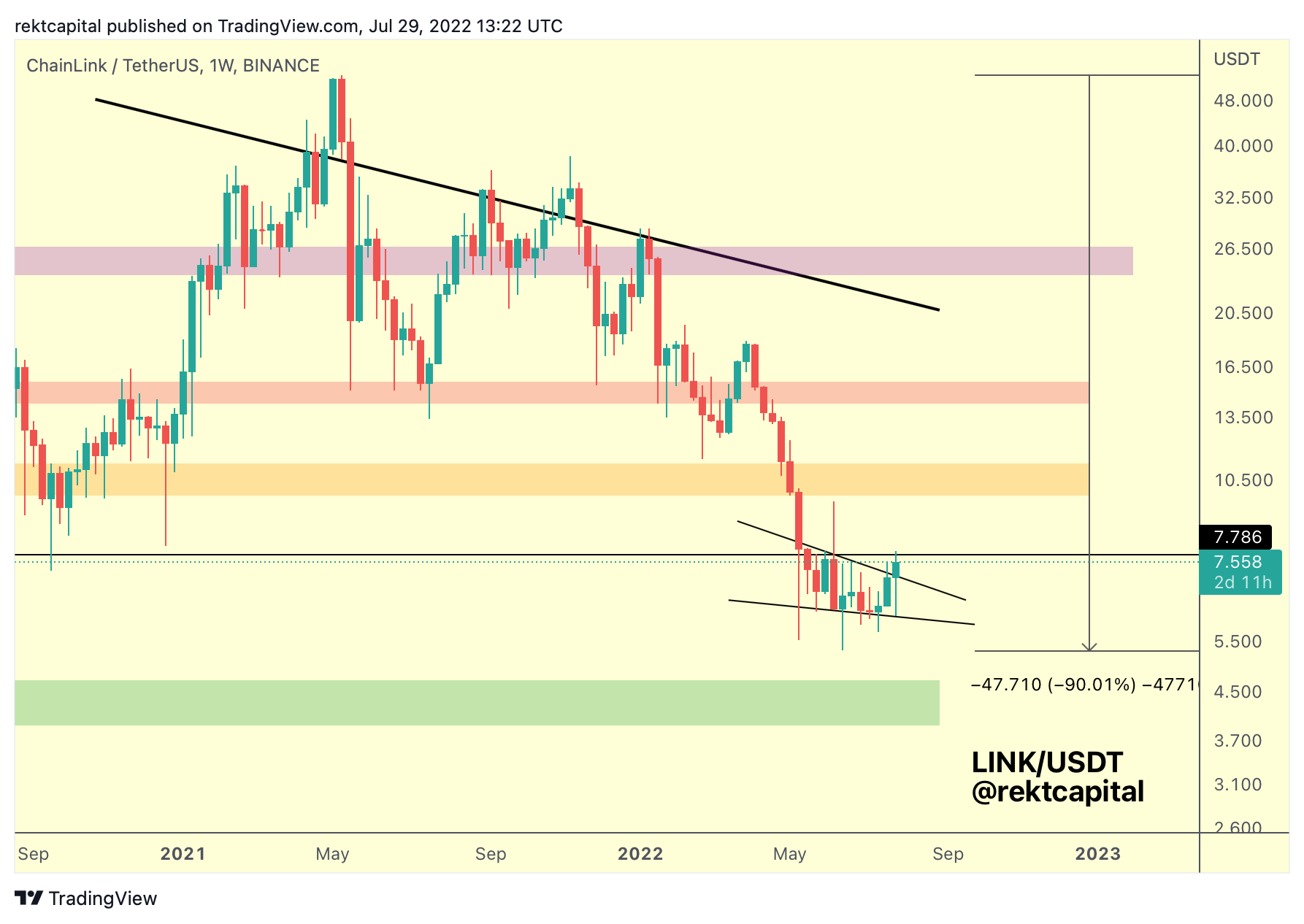 This rebound has actually facilitated a breakout from the wedge, with LINK tagging the black $7.786 resistance.