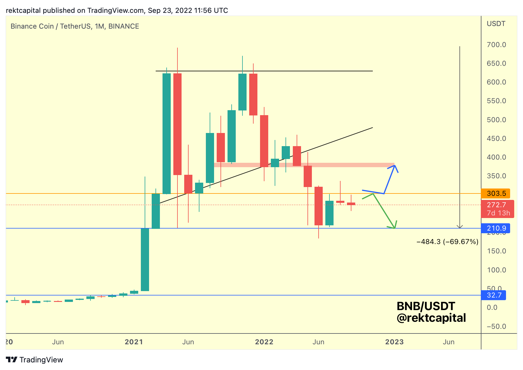 And so as a result, BNB will be more primed for a bearish bias where price could follow the green path.