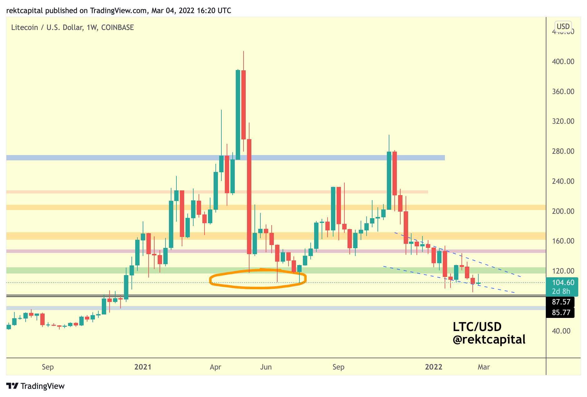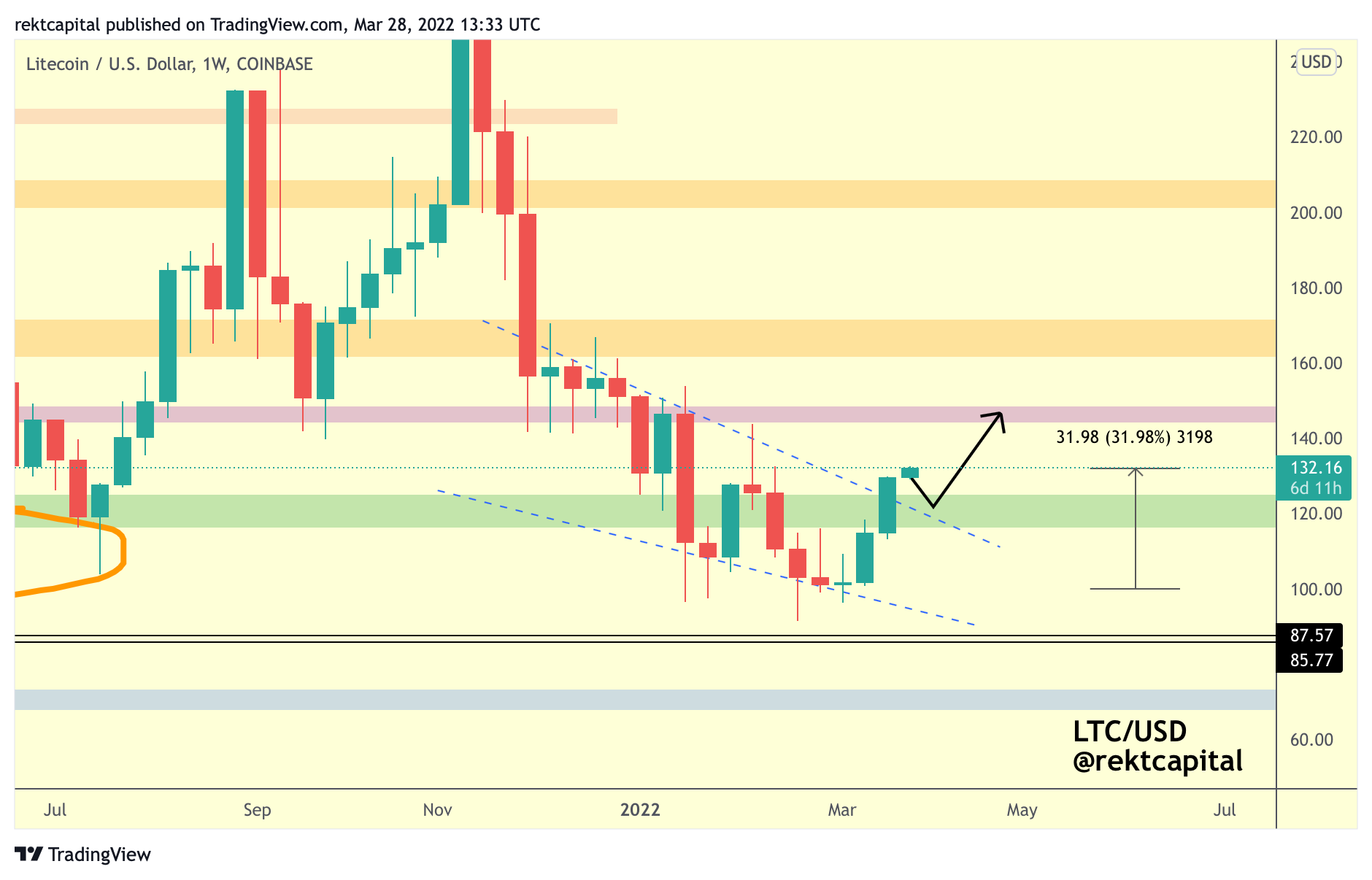 Now LTC has a chance to fully confirm this breakout via a retest of the green area which is a confluent region of support with the top of the Falling Wedge.