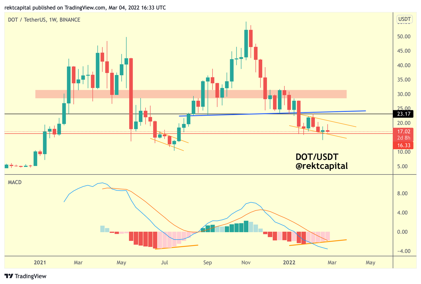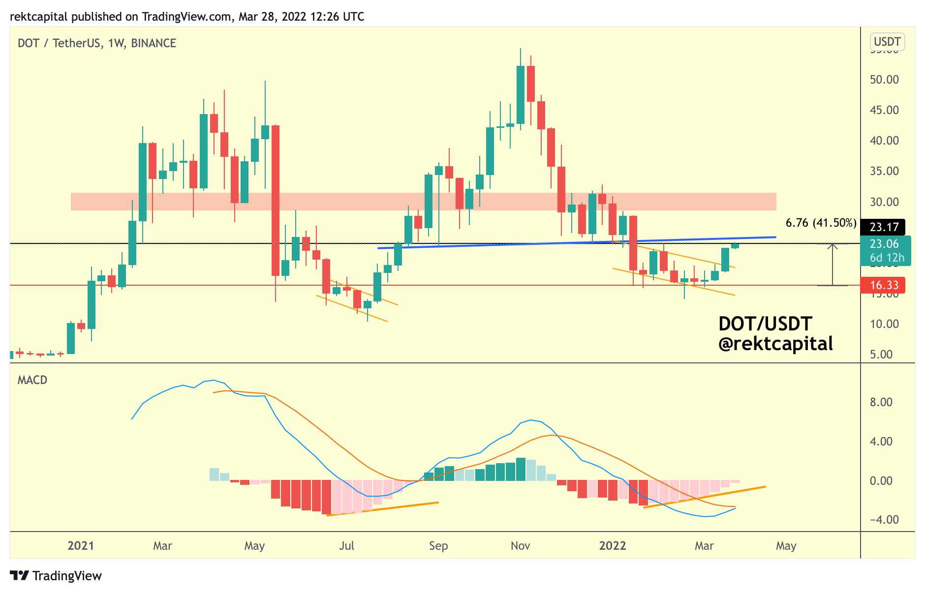 Earlier this March, I spoke about how DOT was finding support at a key Monthly level (red), forming a downtrending channel, and enjoying bullish divergences on the MACD: