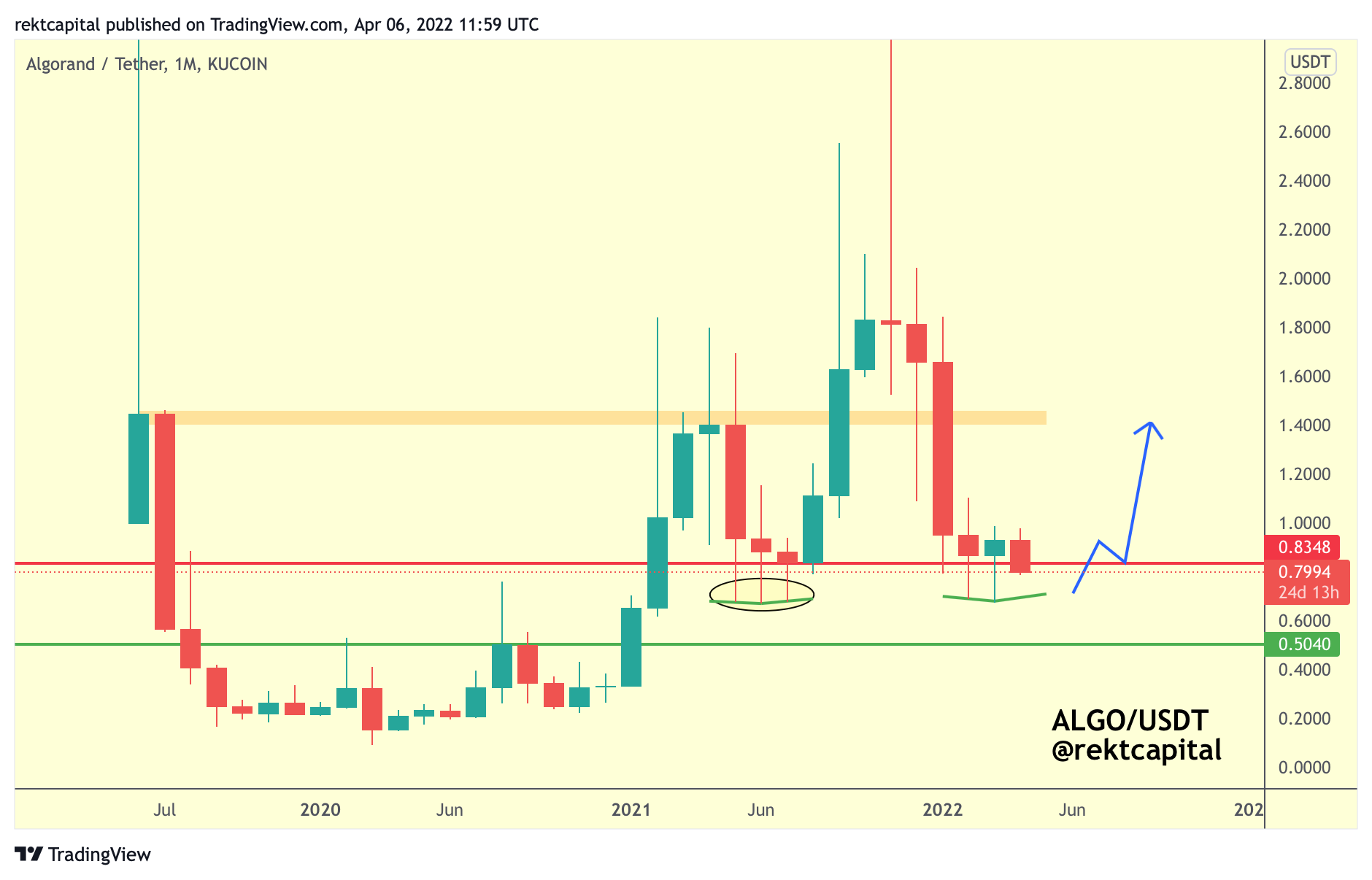 It has already formed a Lower Low with its wicks - if ALGO is able to wick into the green Higher Low I’ve outlined and still Monthly Close above the red $0.83 level then history may very well repeat itself and ALGO will follow the blue path to ~$1.40.