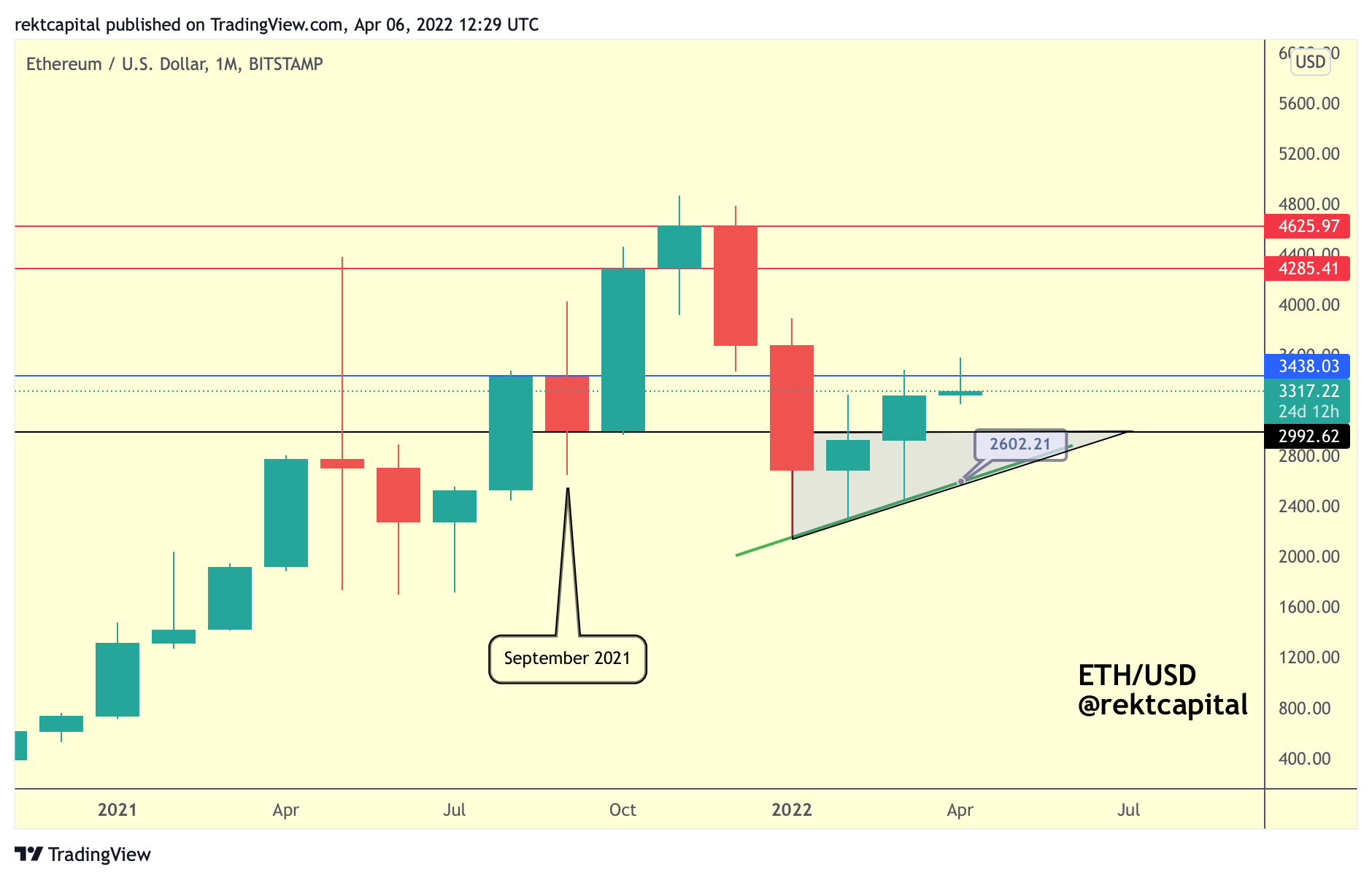 And if the rejection here causes a really volatile retest of the Ascending Triangle triangle (remember the downside wick in September 2021?) then I could see price even go as low as $2600 to the green Higher Low and close the Monthly above $3000.