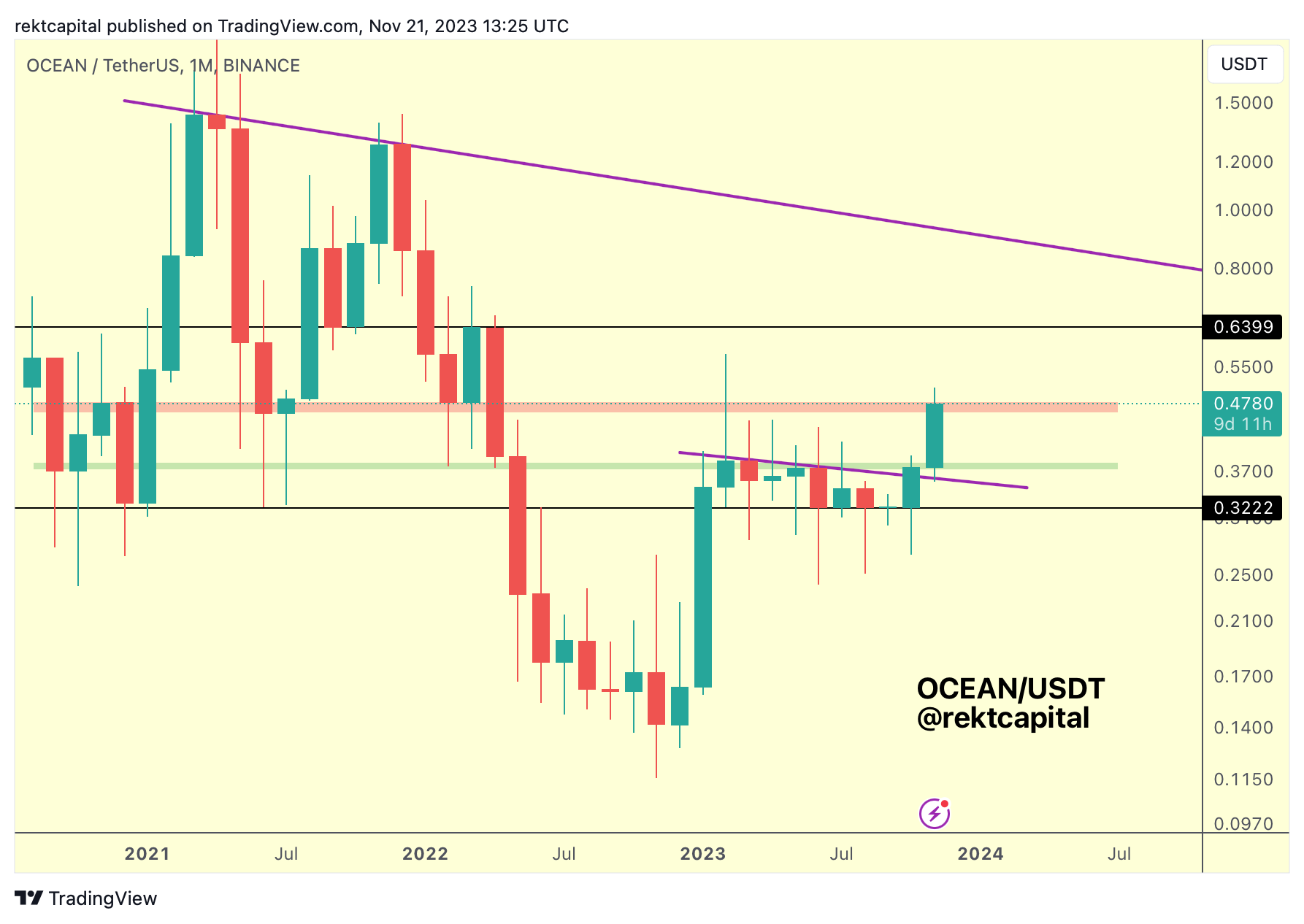 Nonetheless, Monthly Close above the green region would be bullish as it would set OCEAN up for a confirmed breakout, especially if a retest of the diagonal occurs in December.