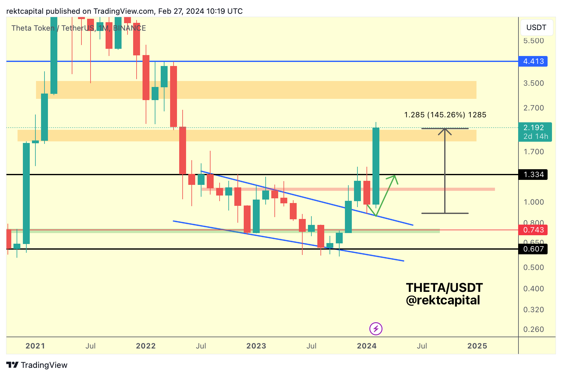 THETA has broken into its orange-orange macro range, revisiting the Range High resistance in the process.