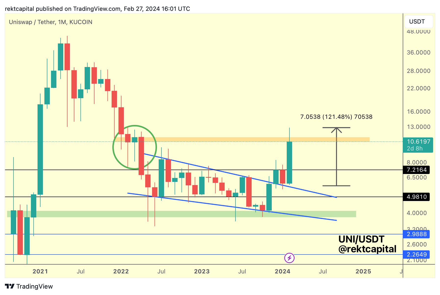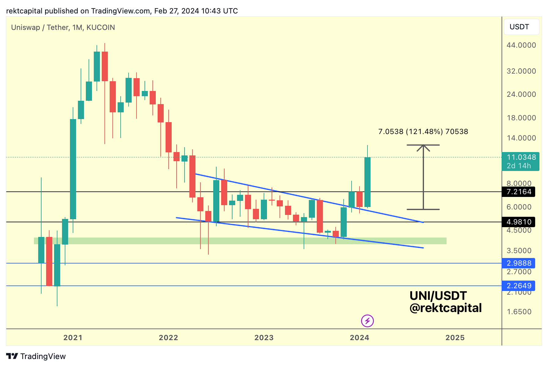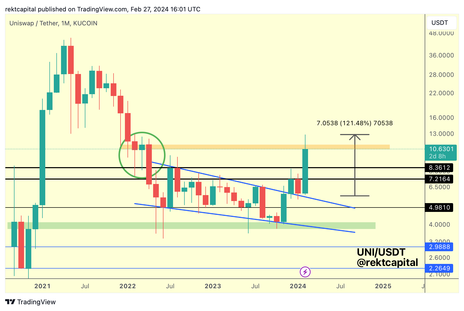 UNI has since rallied a phenomenal amount, fully confirming its new macro uptrend upon breakout from the macro pattern: