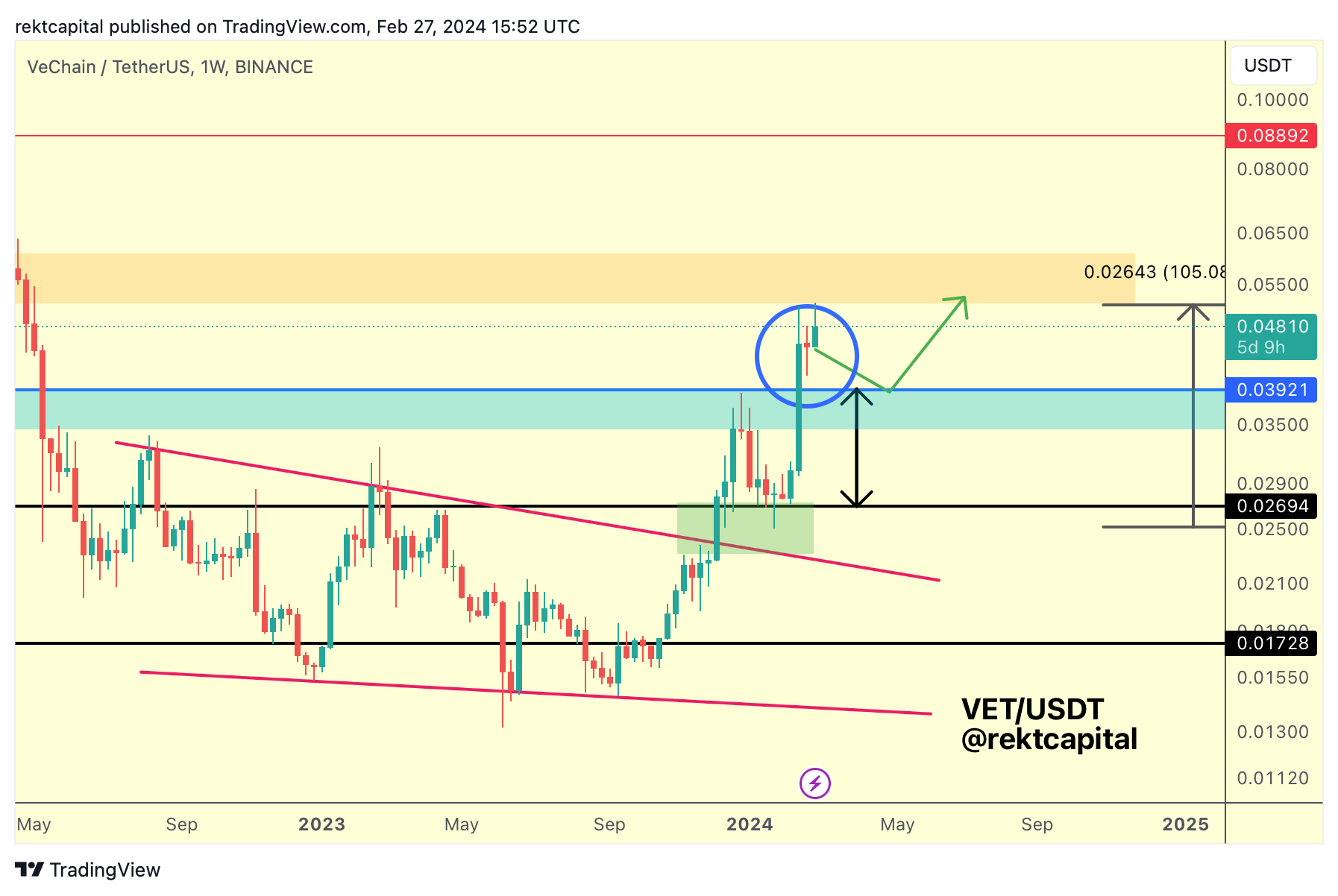In the event that VET doesn’t pullback into the old Range Low but happens to reclaim the orange resistance as support, then VET would skip this consolidation and ascend higher.