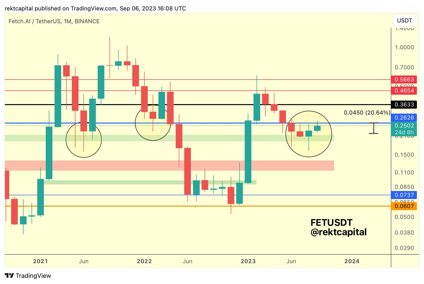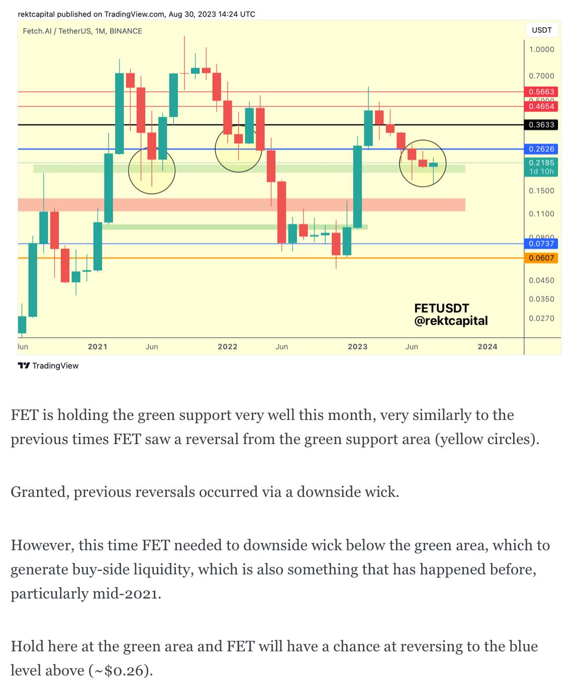 It would be bullish of course for FET to reclaim the blue level as support because reclaiming the blue level would enable FET to rally even beyond the black resistance at $0.36.