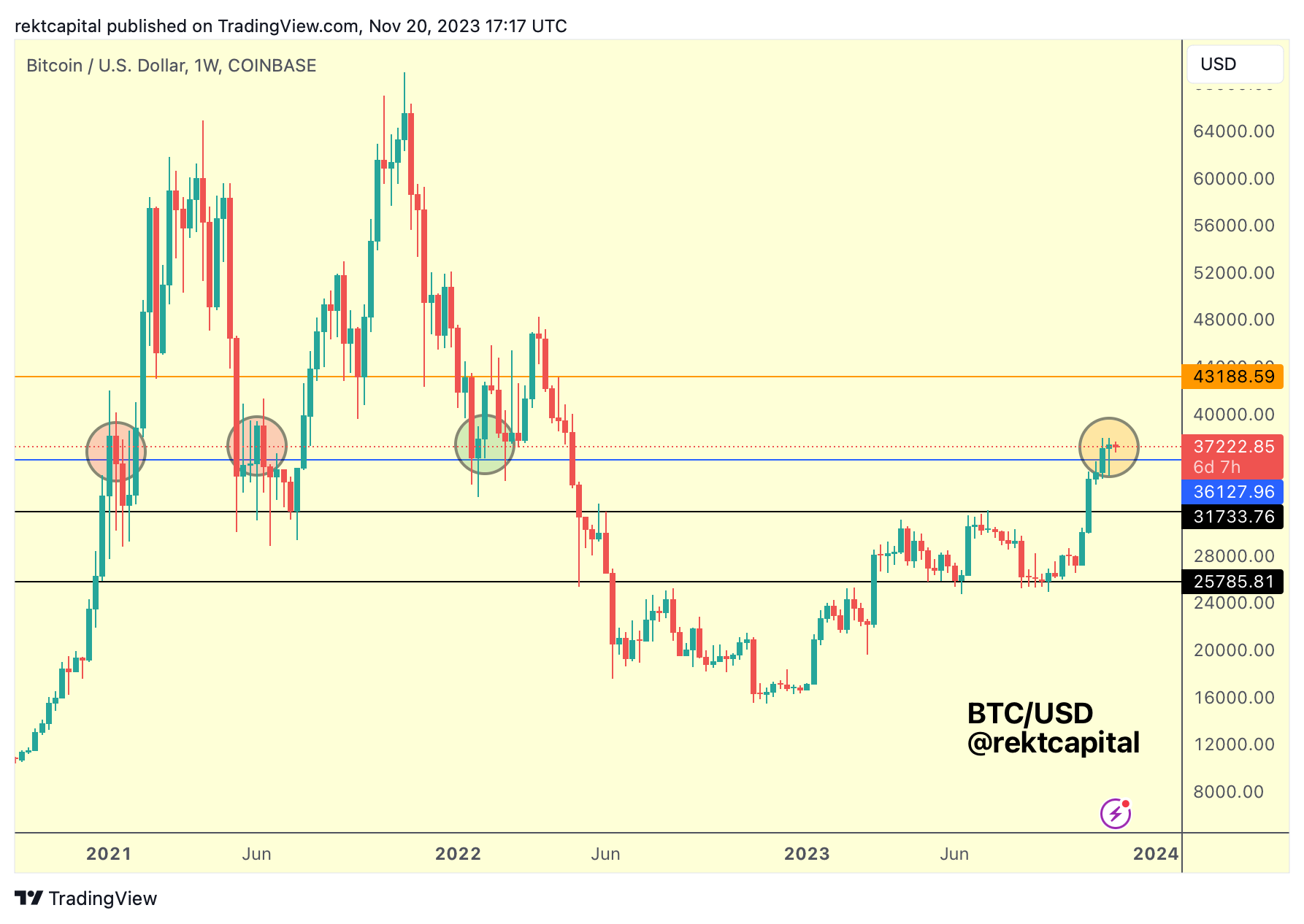 In the past, retests of ~$36150 (blue) would fail (i.e. early and mid-2021) whereas those that didn't fail yielded upside into at least ~$43200 (orange).