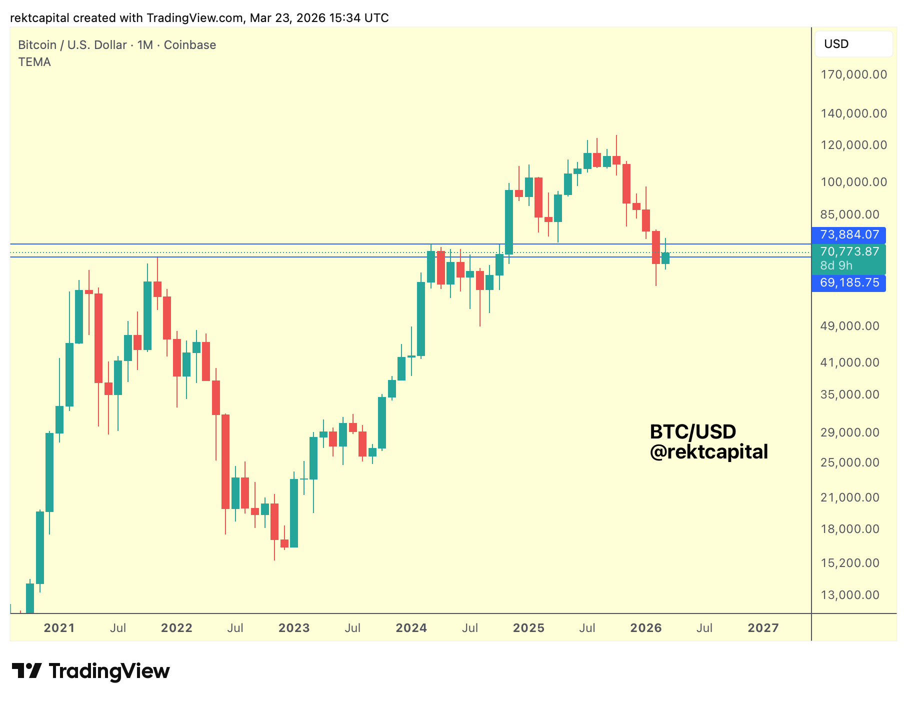 Bitcoin is currently positioned between two key levels: the $69,185 (blue, 2021 All Time High support) and the $73,884 (blue, 2024 All Time High resistance), leaving price effectively sandwiched between former highs now acting as pivot points.