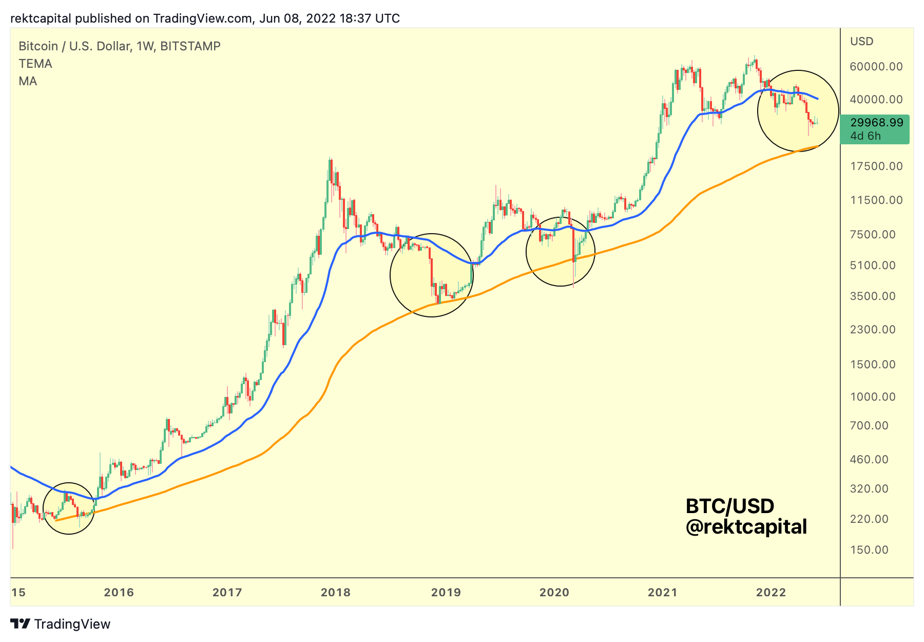 In 2015, BTC rejected from the blue 50-WEMA to rebound from the orange 200WMA.