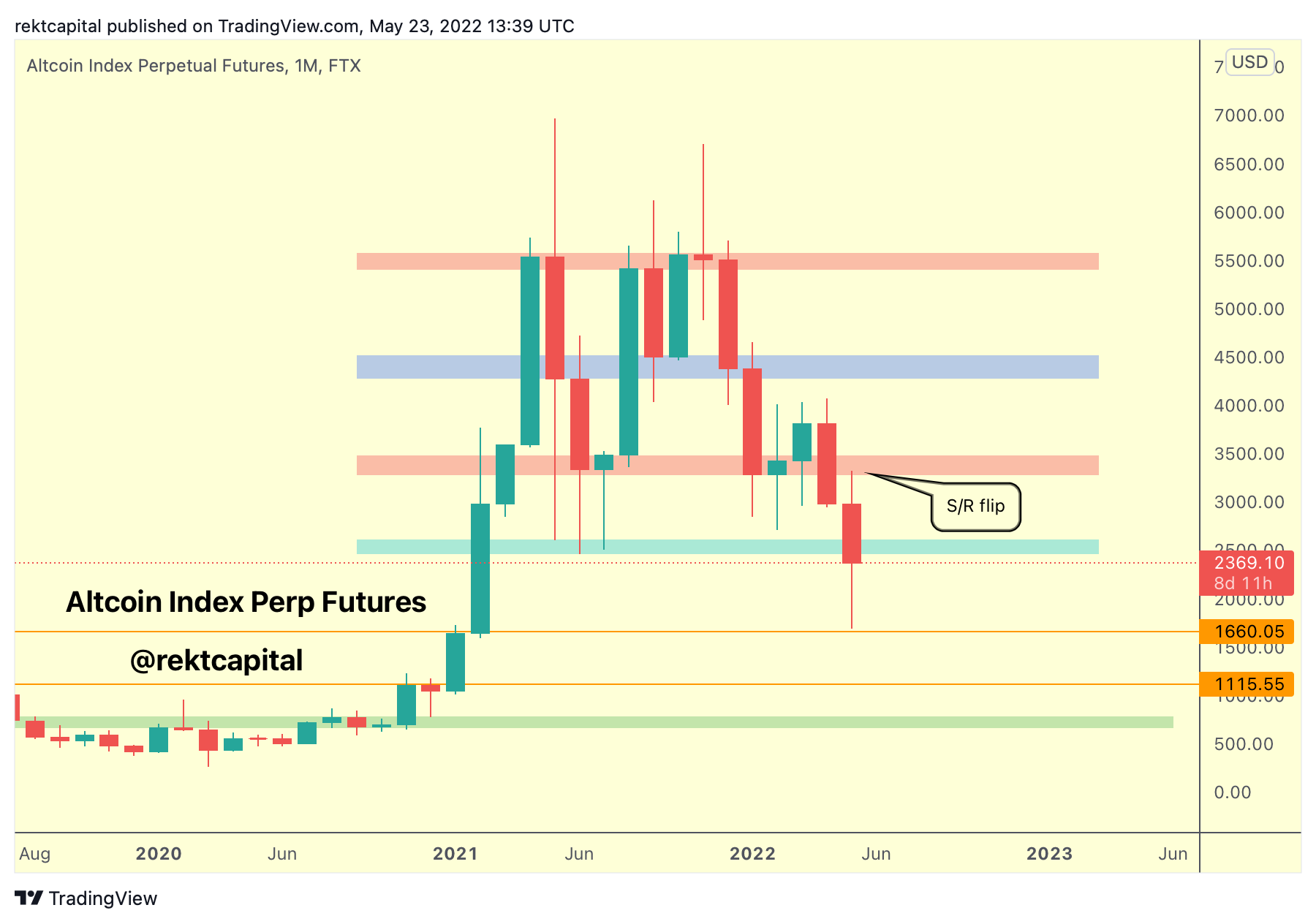 So the upcoming Monthly Close on ETH relative to ~$2269 will be key in confirming a) whether ~$1720 is weakening as support, and b) will ALTPERP Monthly Close below its blue region to confirm relief.