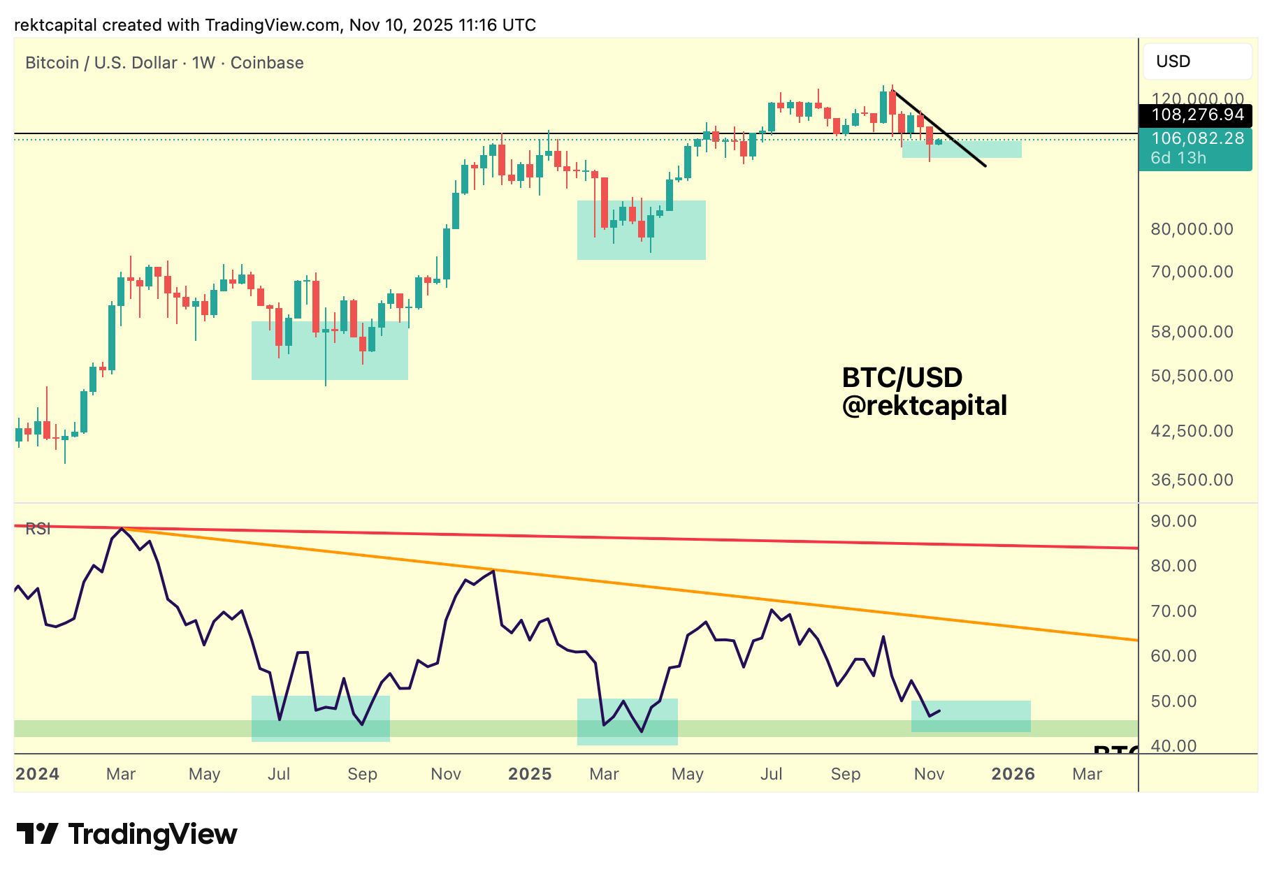 Last week, Bitcoin Weekly Closed below $108000 (black horizontal), a loss that temporarily positions that level into new resistance, even though it hasn't been confirmed as one (unless a relief rally rejects from there, that is).