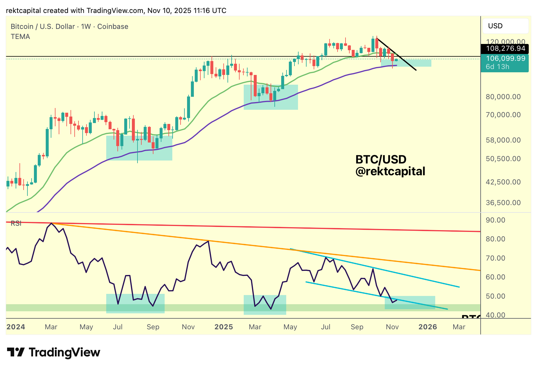 If this reclaim succeeds, RSI would resynchronize with its own Channel, opening room for short-term price continuation toward $108000 (black) and potentially beyond on reclaim of $108k.