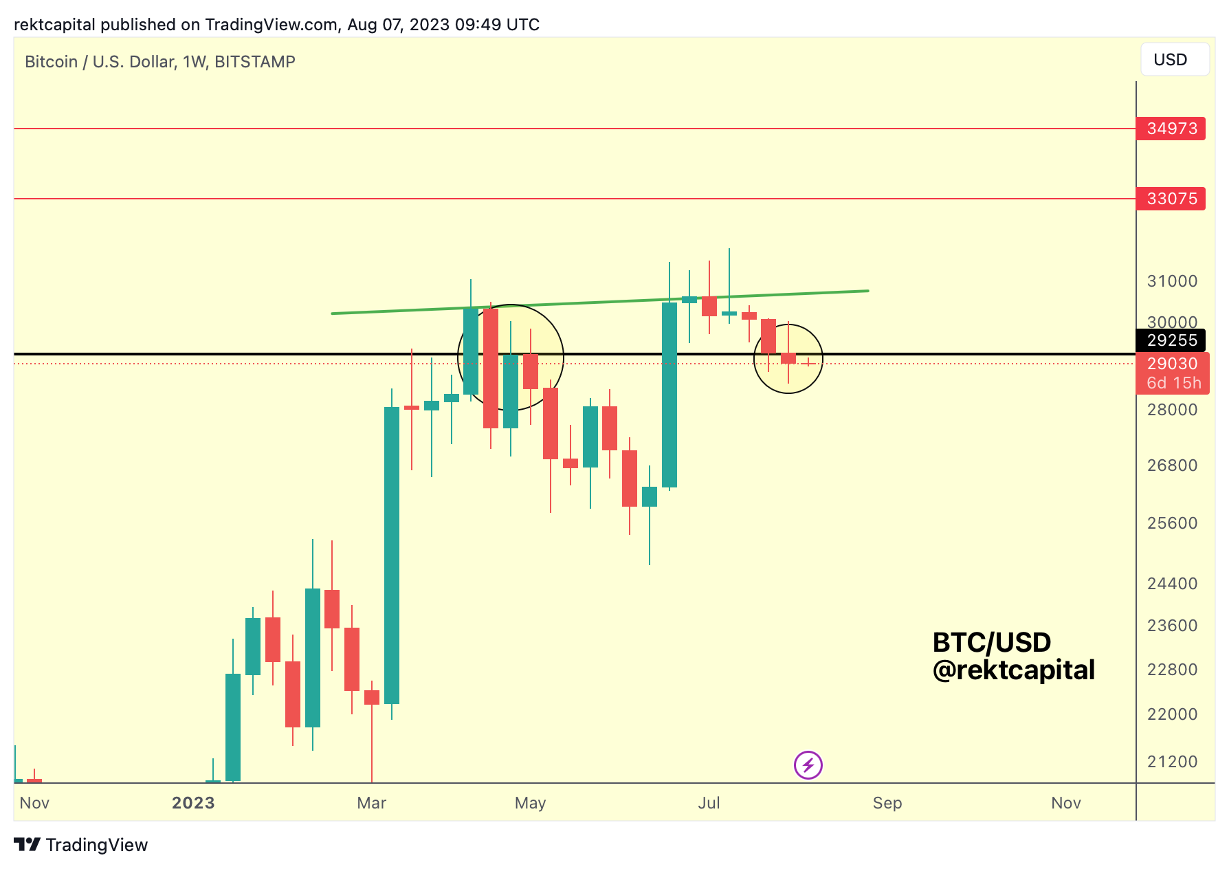 This is the first Weekly Close below the black ~$29250 after price made its high in late June; this situation resembles closely when BTC made its first high in mid-April high which was then followed by the first Weekly Close below ~$29250.