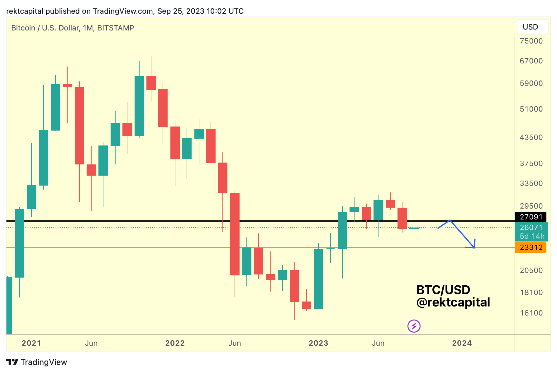 Bitcoin looks like it has confirmed this ~$27150 level into new resistance and a Monthly Close below black would confirm that.