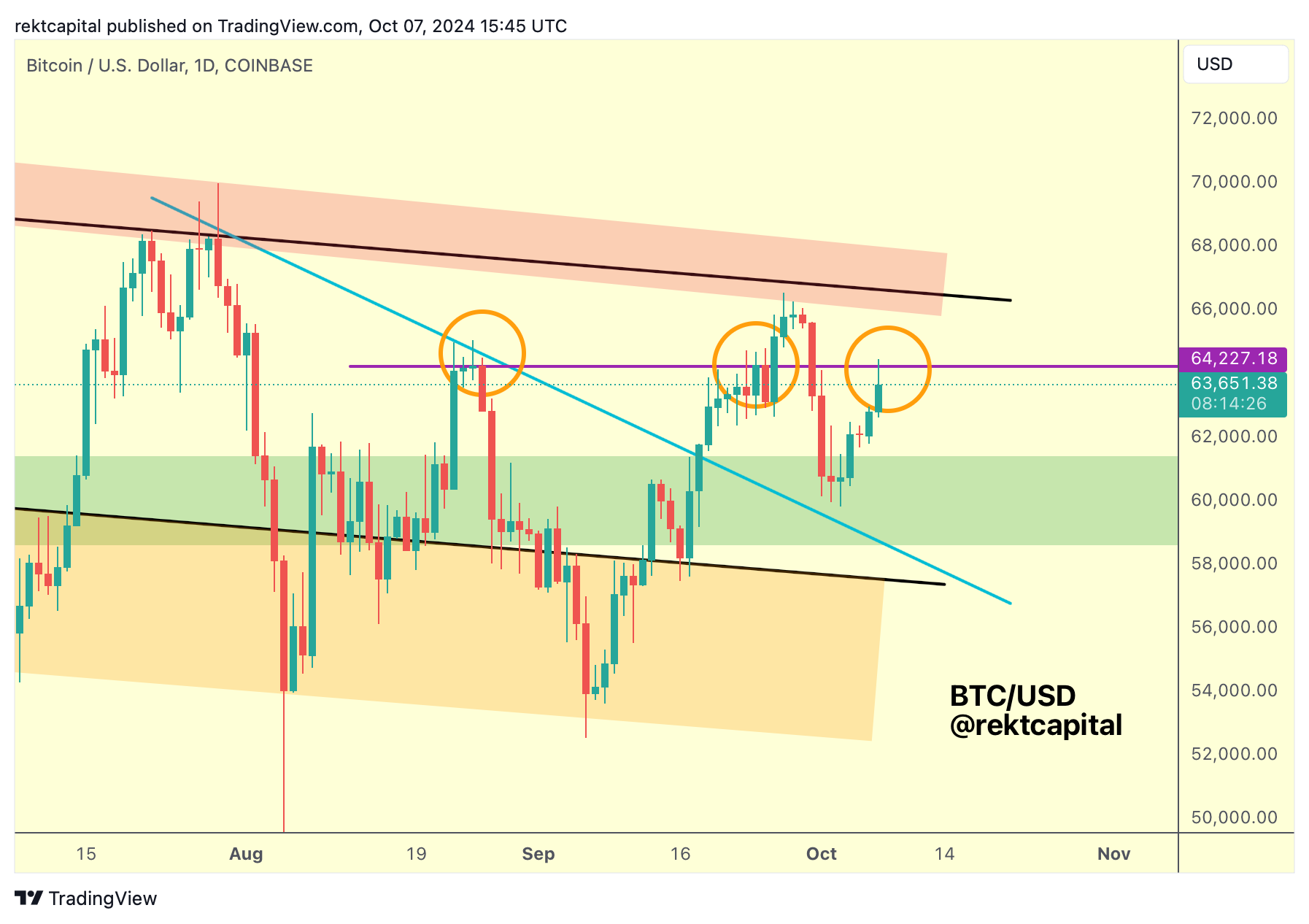 However, BTC needs to first reclaim the $64200 August highs as mentioned earlier and then break the Downtrending Channel Top if it wants to challenge for the ReAccumulation Range High at ~$71300 (red).