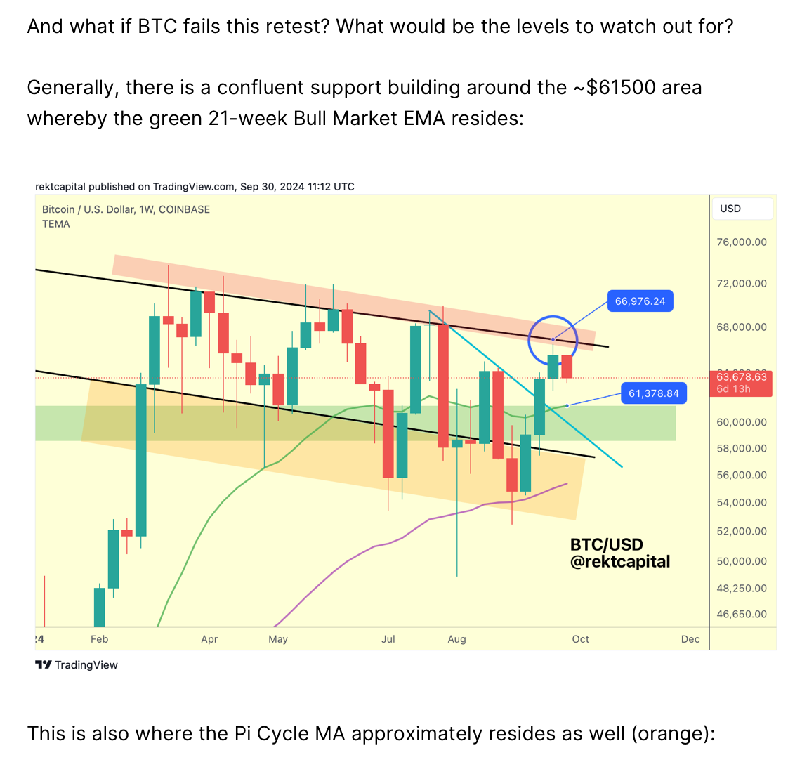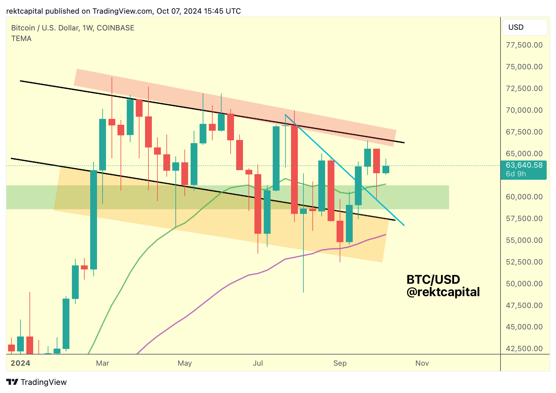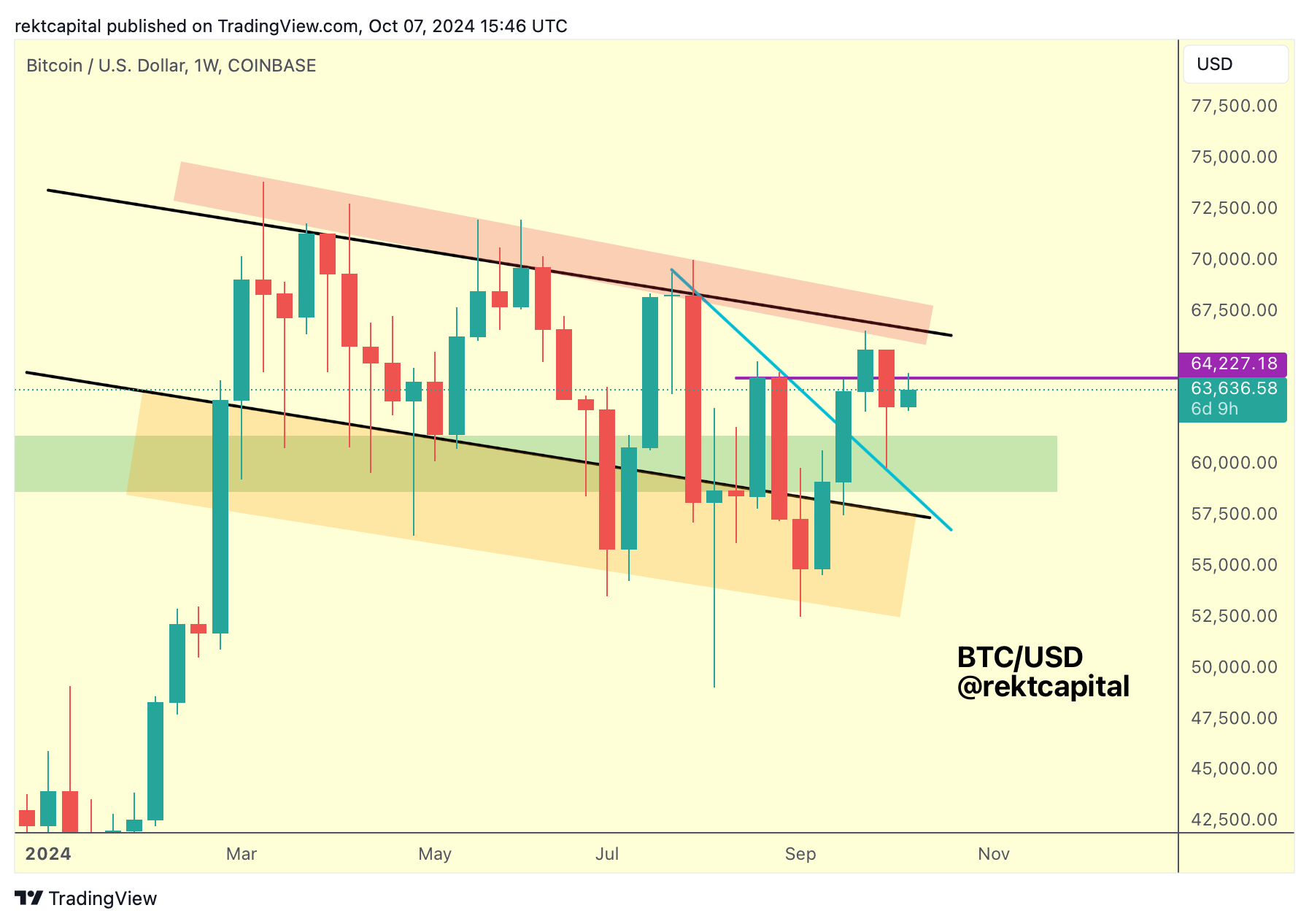 Last week, BTC failed to retest the purple August highs (~$64200) as support and this week price will need to reclaim them if it is to try to challenge for a breakout beyond the Downtrending Channel Top.