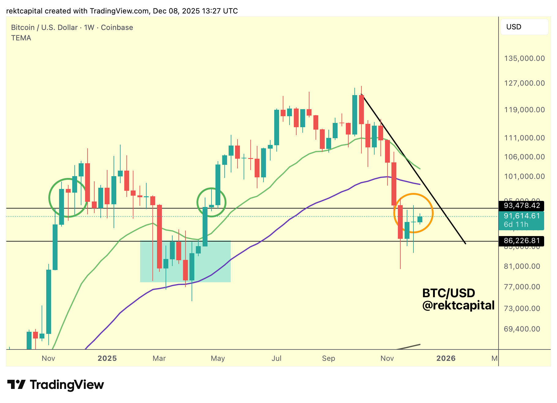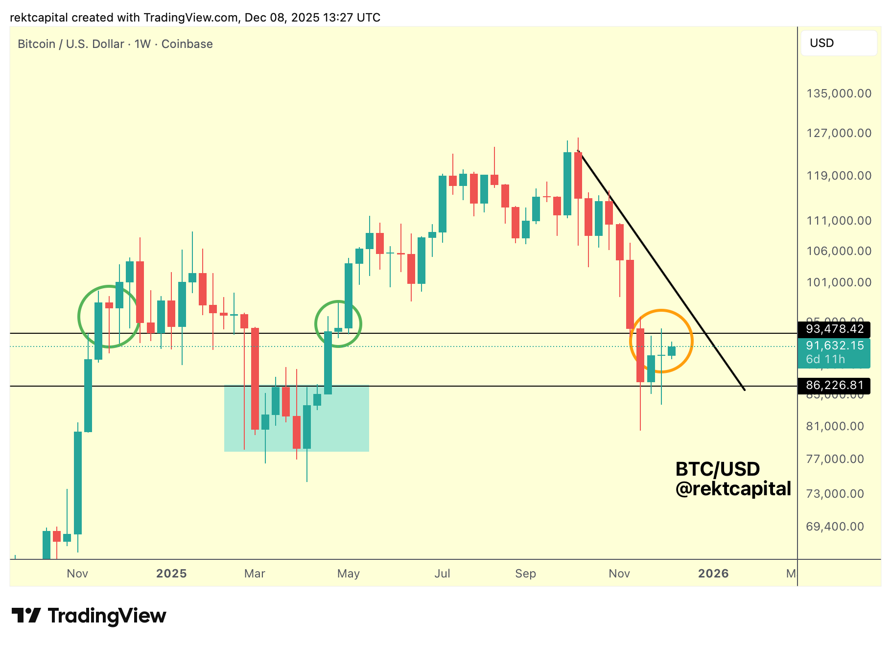 As this structure matures, the key trigger for any bullish continuation remains the same: a Weekly Close above the Range High at $93,500 (black), followed by a post-breakout retest.