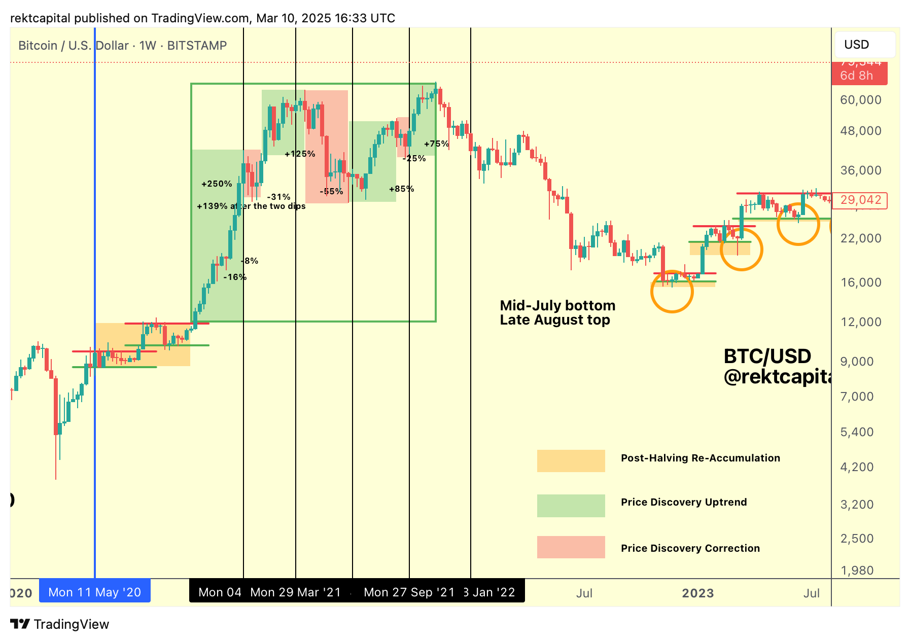 By extension then, the orange boxed top highlighted in the chart in 2021 was the local top of the Second Price Discovery Uptrend, whereas the orange boxed top in this cycle is the local top of the First Price Discovery Uptrend in this cycle.