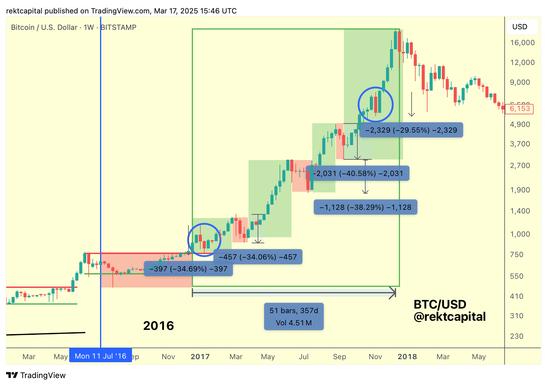 And in 2017, BTC would drop -34% to -40%, with -29% being the shallower of all pullbacks in that cycle: