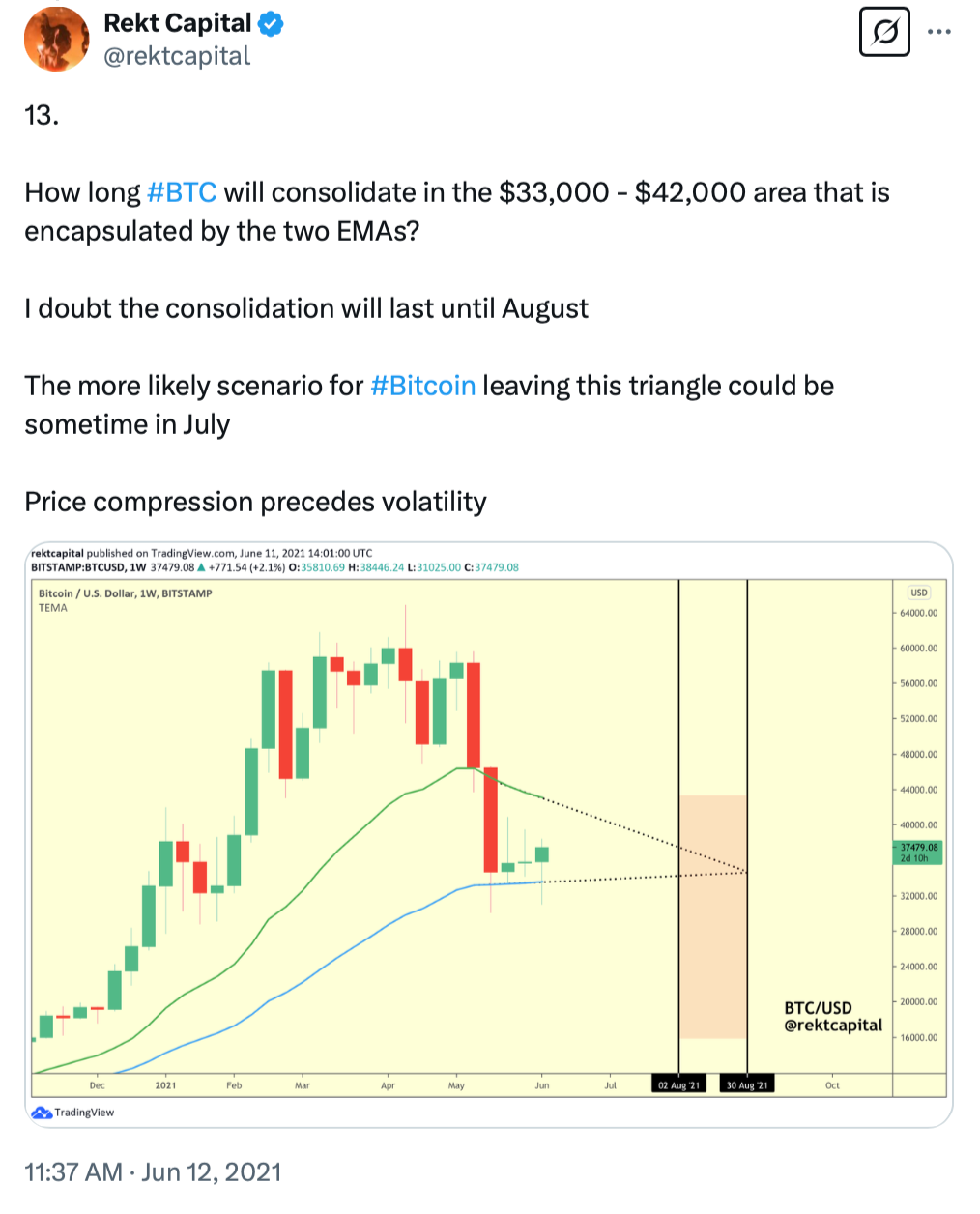 Back in June 2021, I posted about how Bitcoin's price action was consolidating between two key Bull Market EMAs: the green 21-week EMA and the blue 50-week EMA.