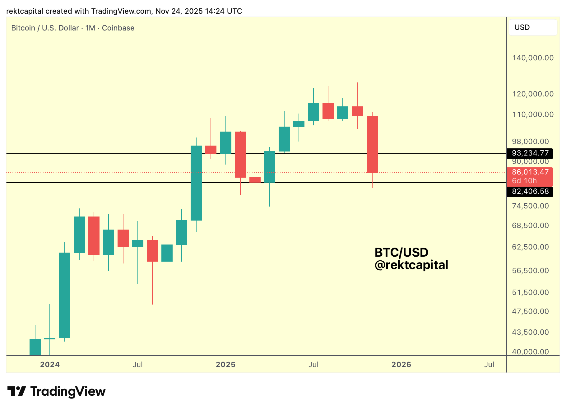 On the Monthly timeframe, price has revisited a key re-accumulation region around $93k (black).