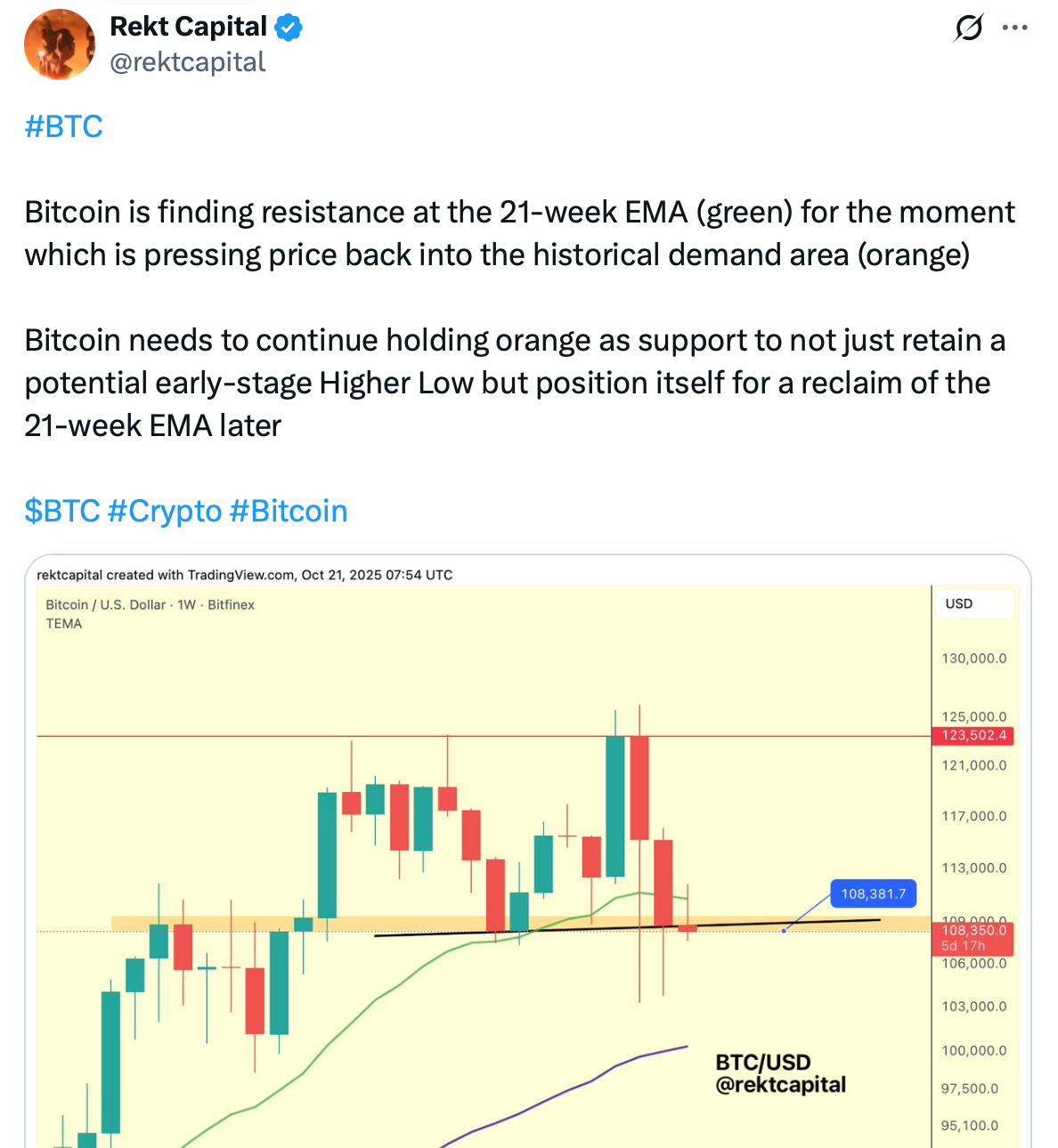 Bitcoin has since not only successfully retested the orange area but also performed a Weekly Close above the 21-week EMA (green):