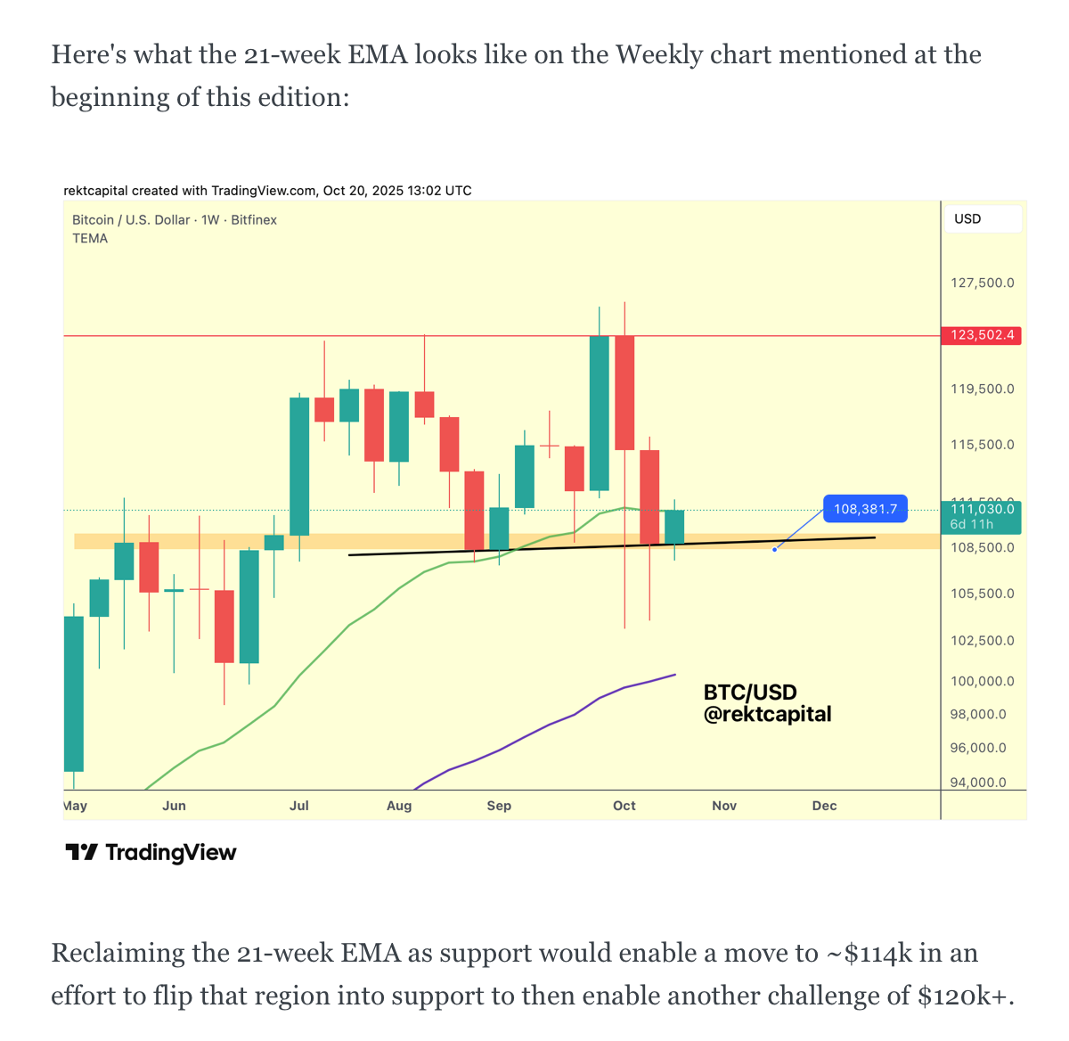 In fact, just last week here in the Newsletter we spoke about how Bitcoin needed to not just hold the orange area as support but also reclaim the 21-week EMA (green) as well to position price for a revisit of $114.5k (black):