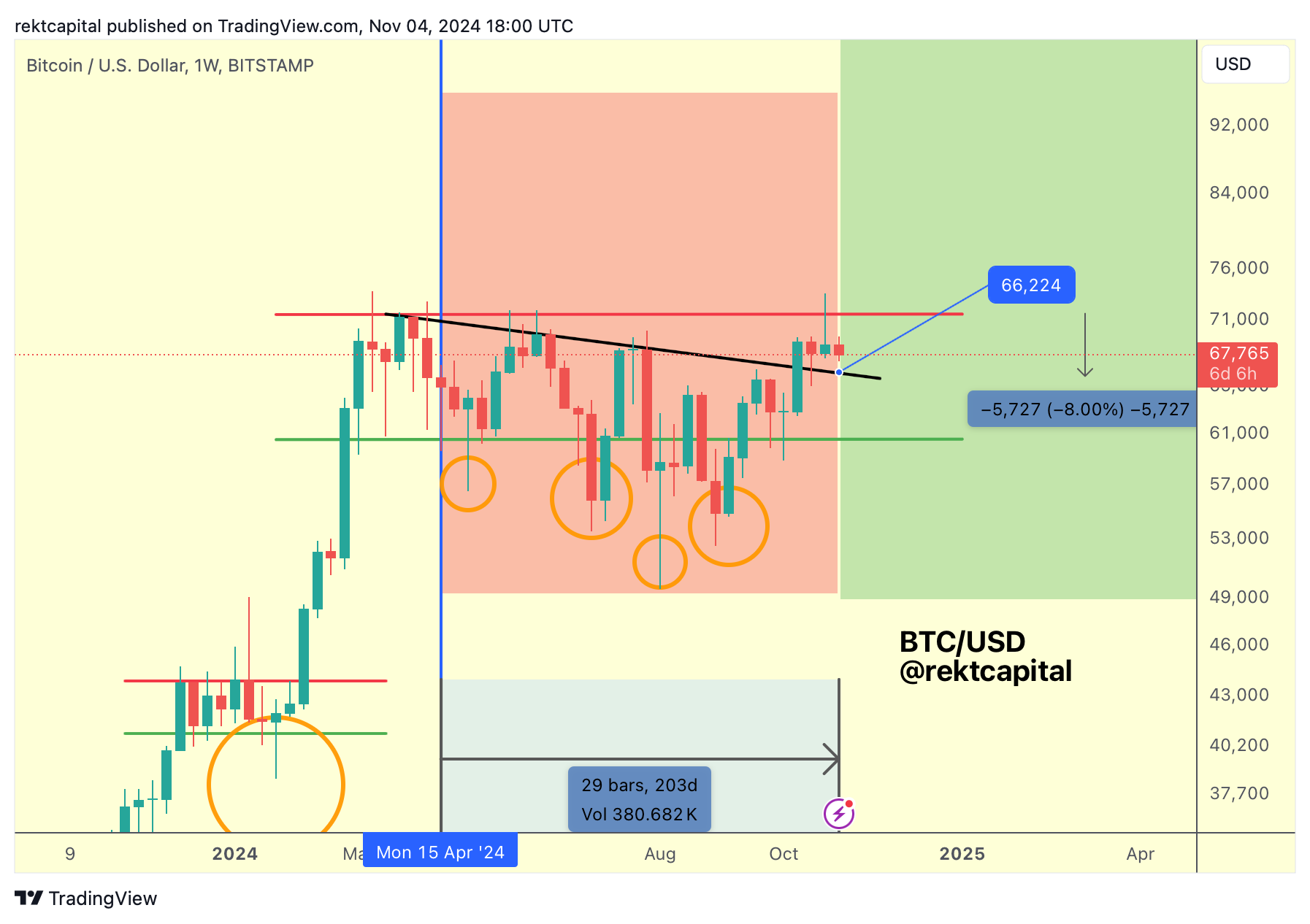 That would see price drop into ~$66200, provided that such a pullback occurs this week; the black diagonal is a dynamic resistance and declines over time, representing lower and lower prices over time.