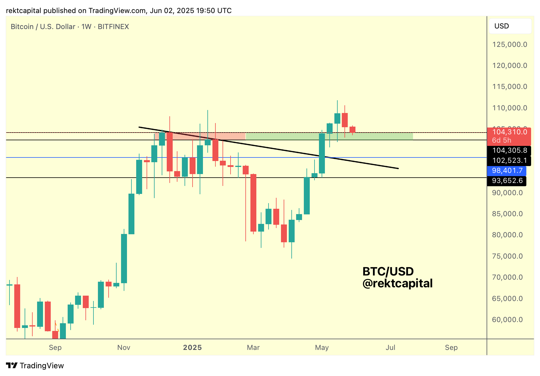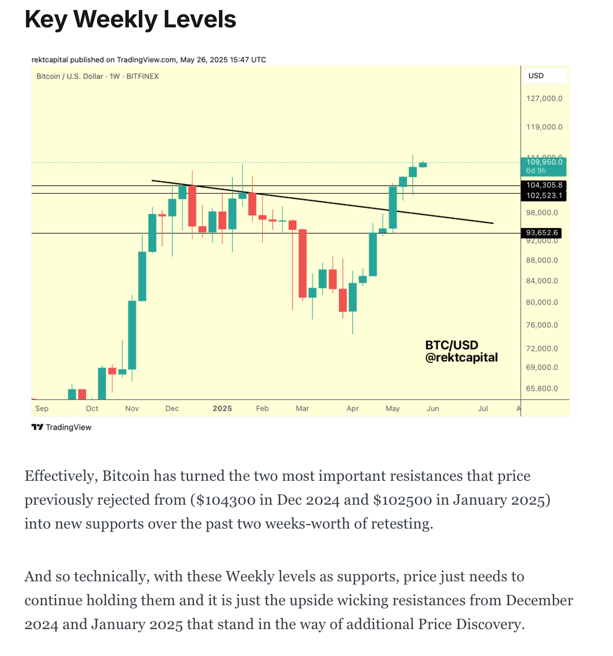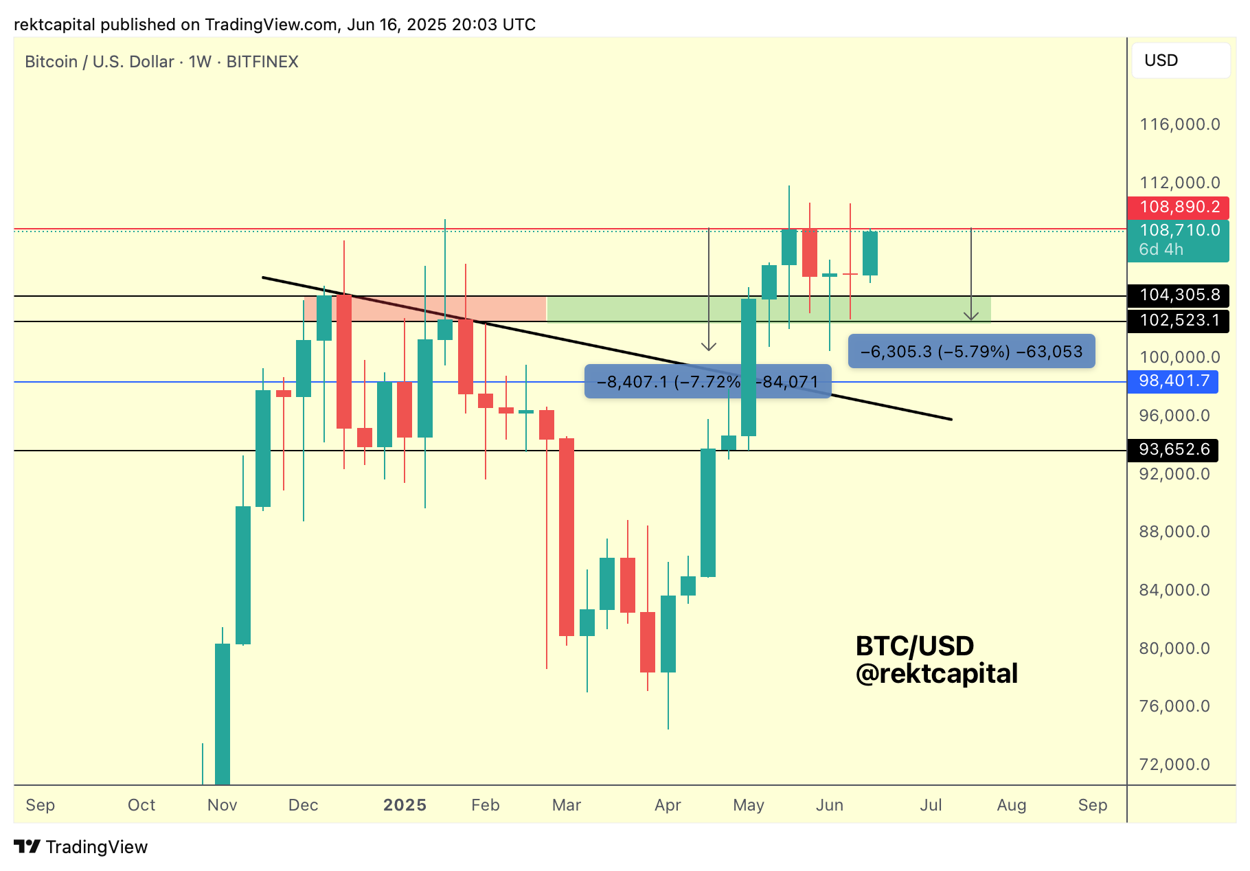 More, it's felt like price can lose the $104400 level at any moment over the past 6 weeks but it really is all about the Weekly Candle Closes; as long as price Weekly Closes above $104400, the wicking is just noise.