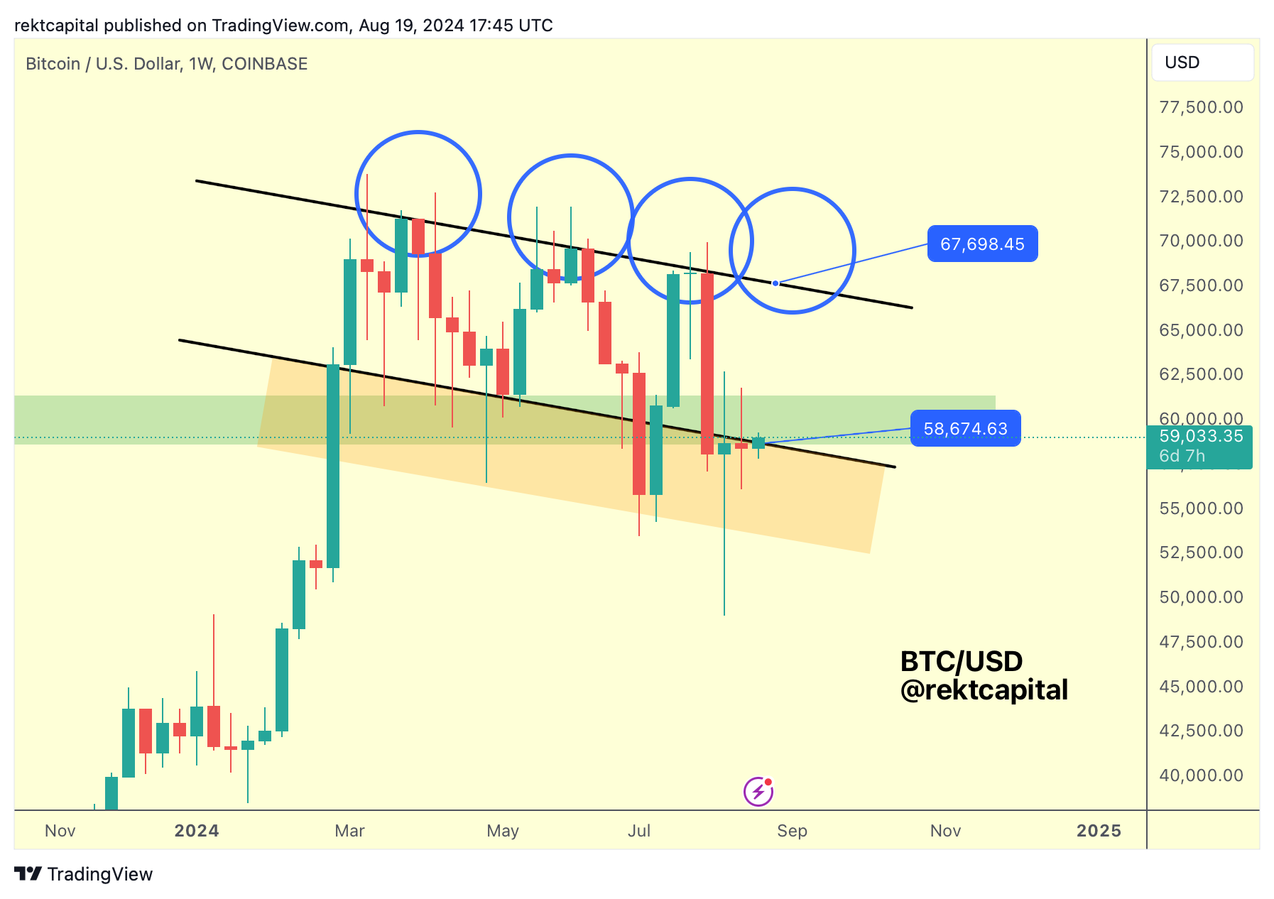 Last week, the price point of the Channel Bottom was $58888 but this week that figure has slightly dropped to ~$58674: