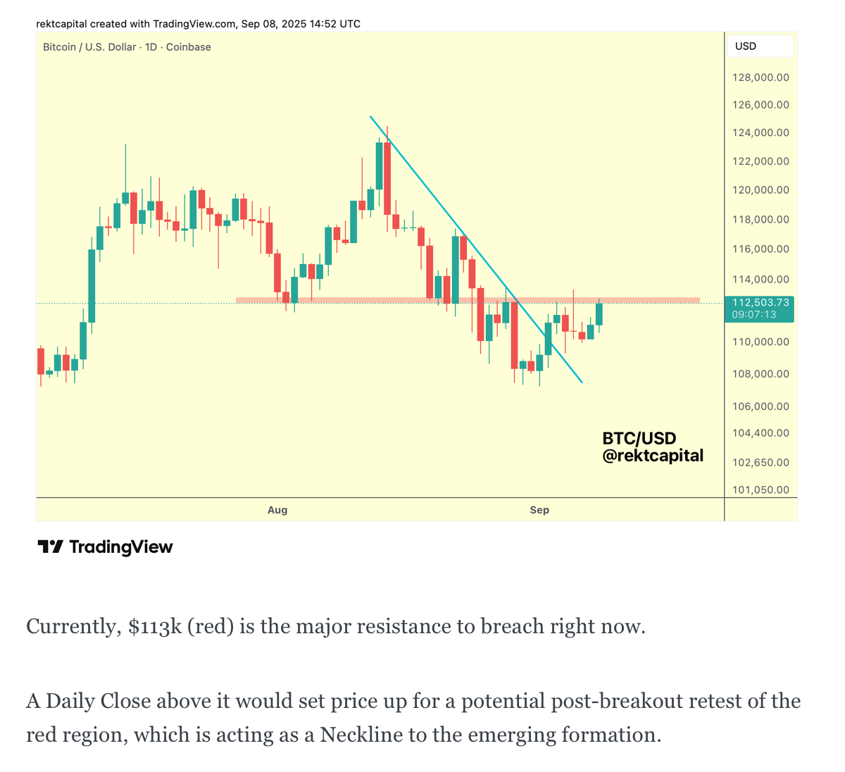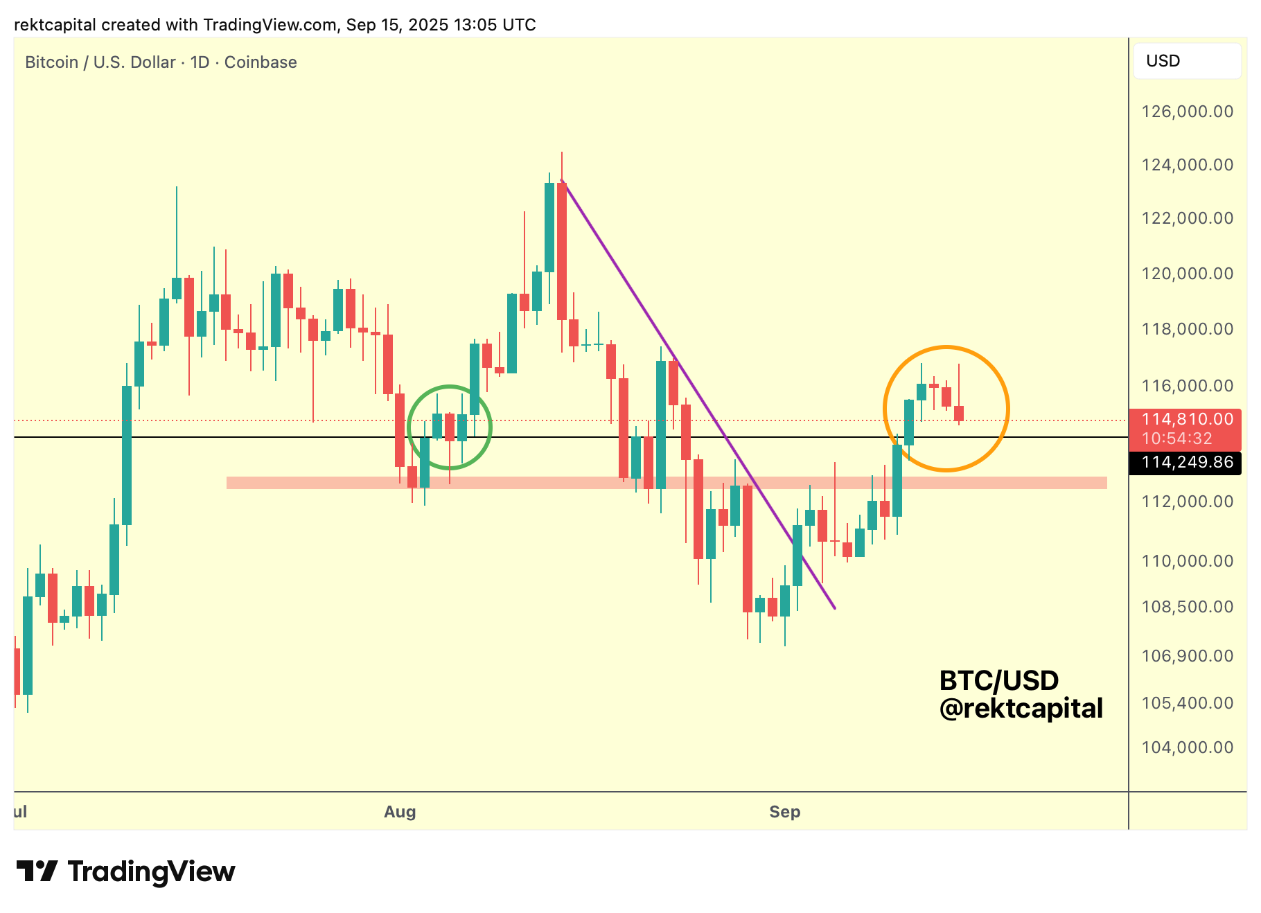 Whereas because this current cluster (orange circle) is building a little higher up, it's not clear if price will be able to downside wick all the way into the $113k area (red), even though that would make sense from a technical perspective in the form of a post-breakout retest of the Daily Neckline.