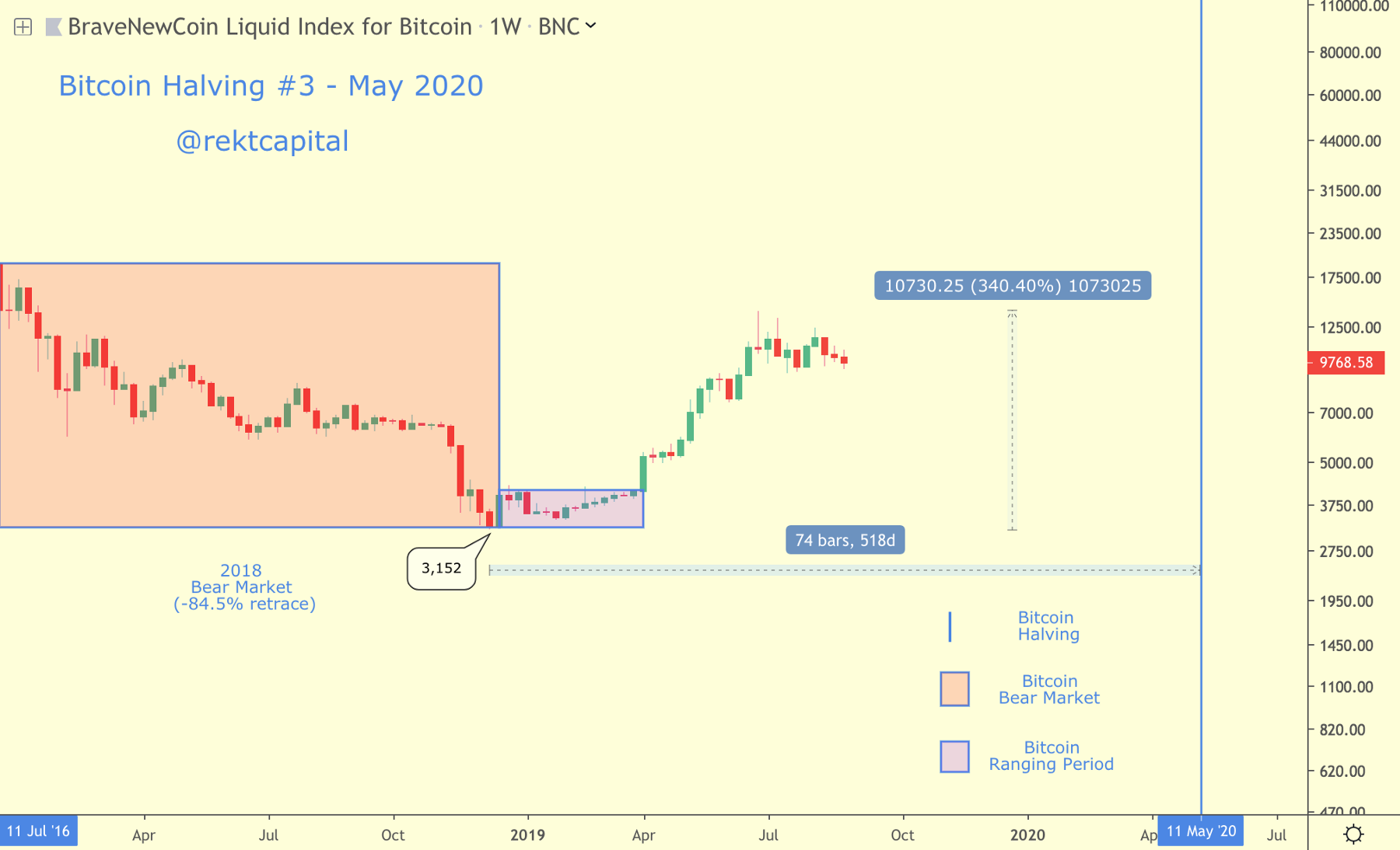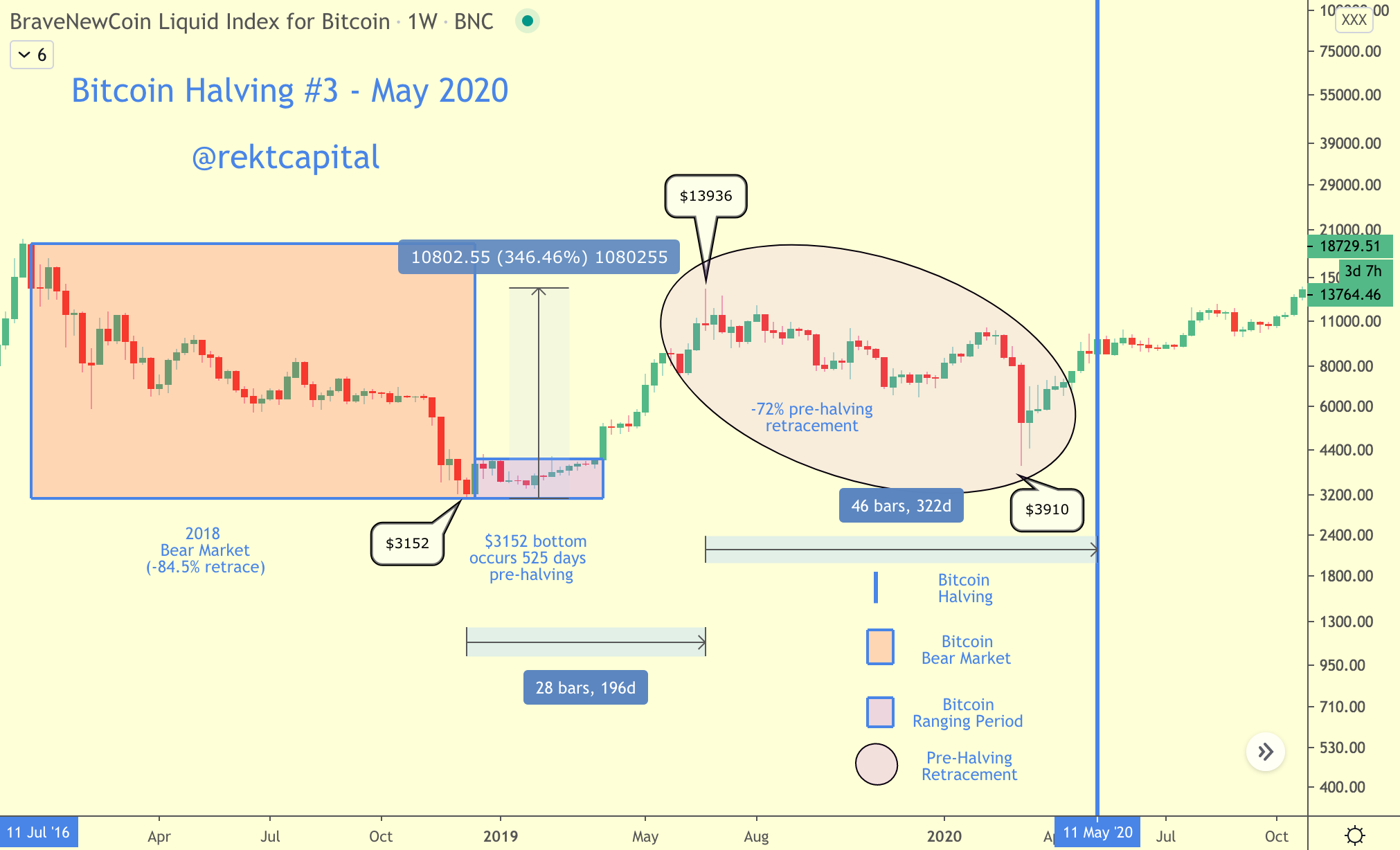 As discussed earlier when covering the historically recurring pre-Halving retraces, it is clear Bitcoin indeed repeated the tendency of experiencing a retrace prior to the Halving after setting its Market Cycle high of $13,900.