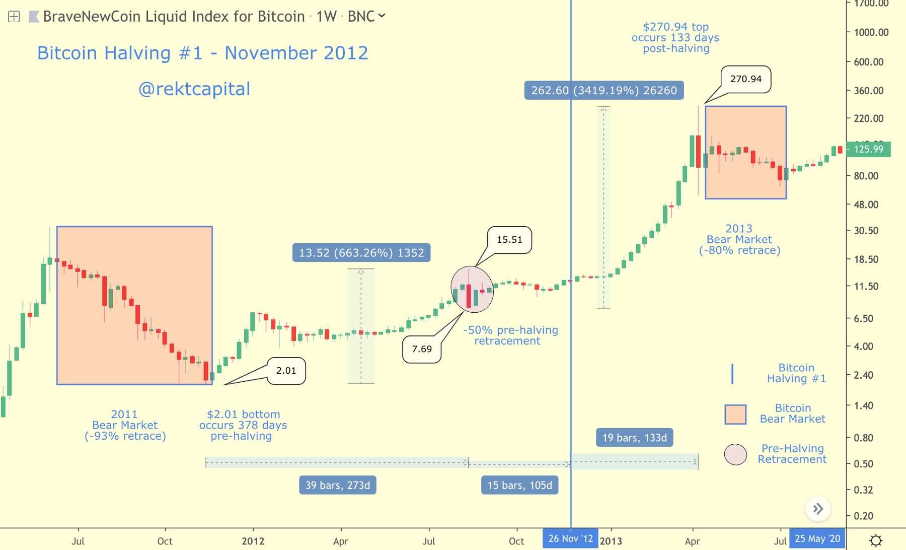 The pre-Halving #1 retrace occurred approximately 100 days before the Halving, was -50% deep, and lasted 2 days.