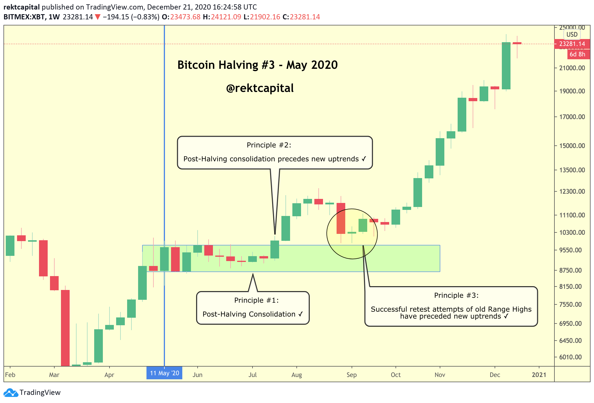 Let’s illustrate these three tendencies in the context of Bitcoin’s post-Halving price charts to showcase how history indeed does repeat itself time and time again.