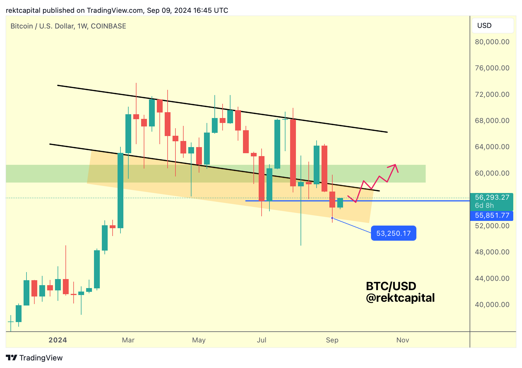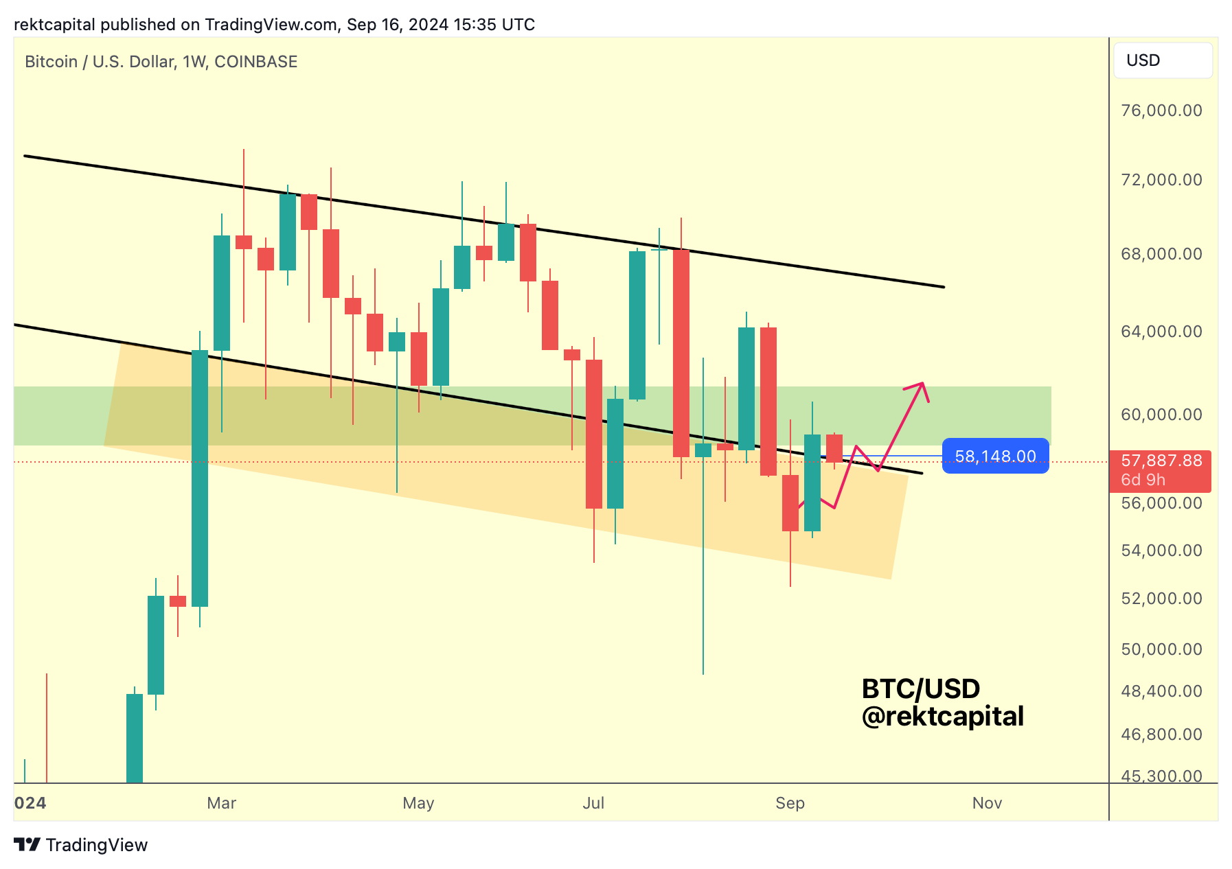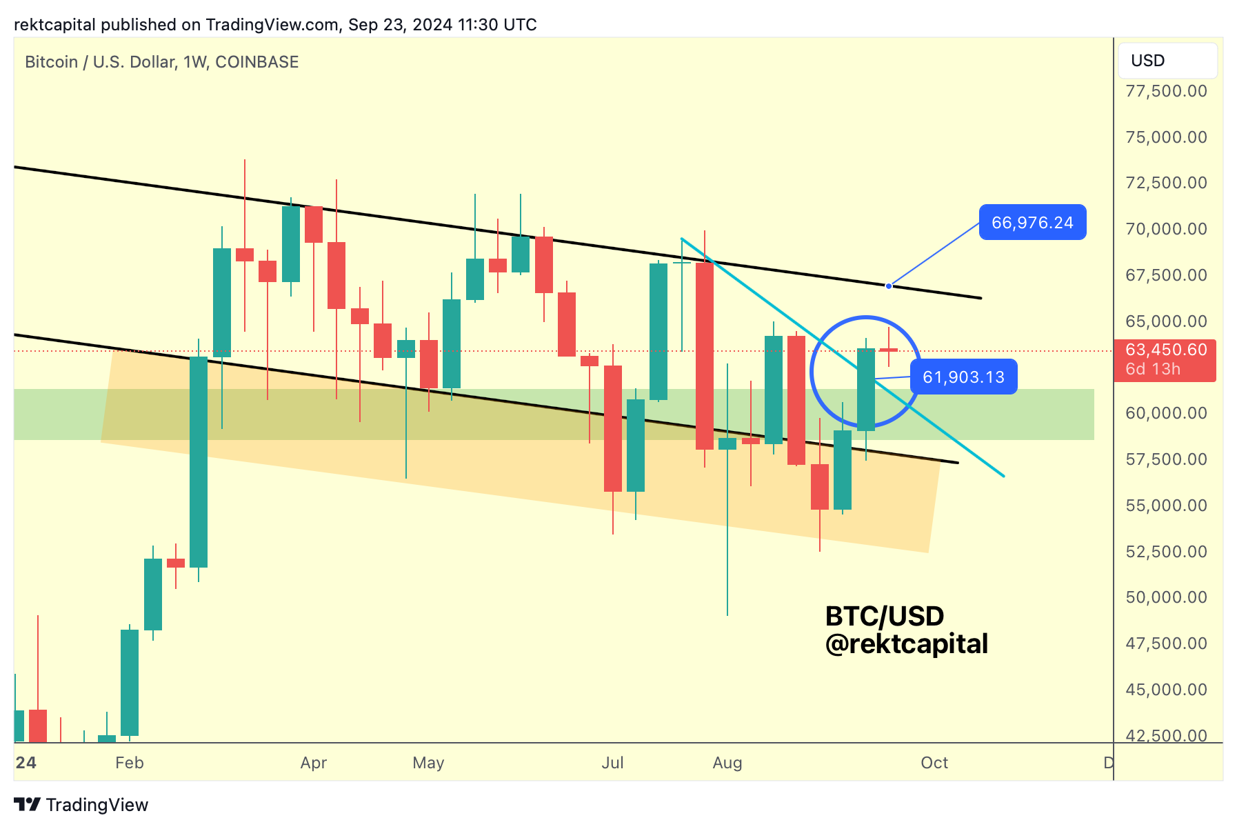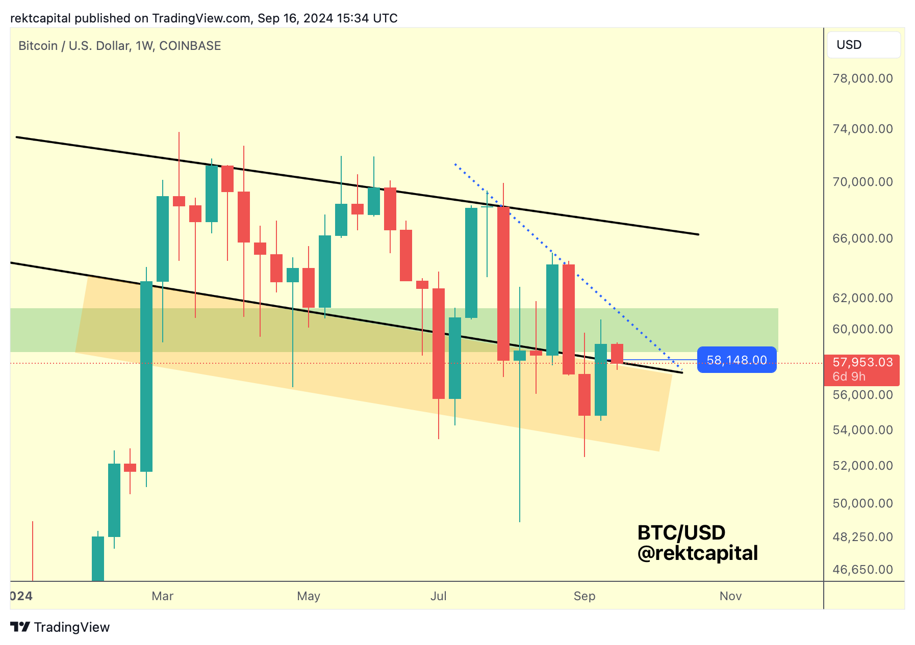 There may be downside volatility on this retrace but if BTC is able to Weekly Close above this green level, then price will likely re-challenge the Downtrending Channel top (black) in early October.