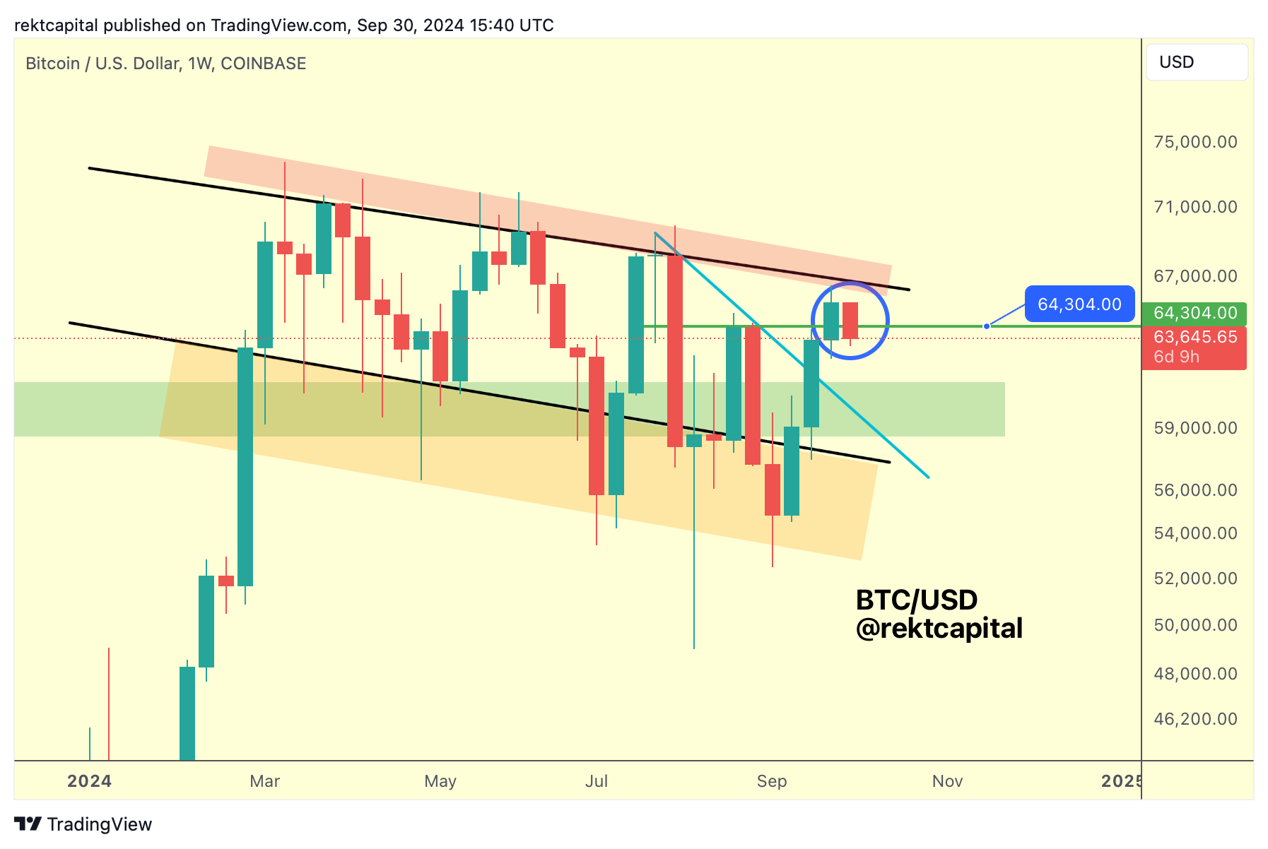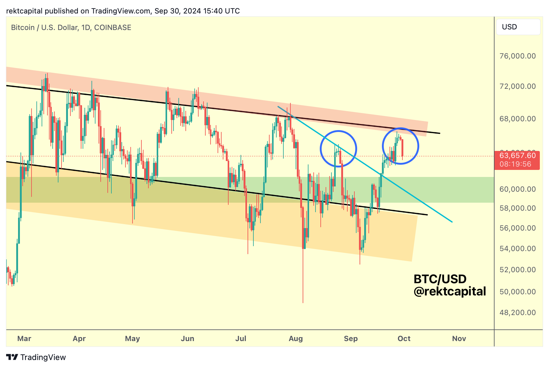 Throughout the entire month of September, we've been covering Bitcoin's ascent with decent accuracy, first starting of with finding a base inside the bargain-buying region resting below the Channel Bottom (orange box):
