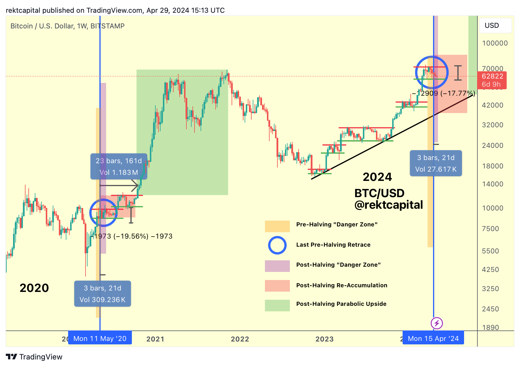The Post-Halving "Danger Zone" suggests based on 2016 post-halving price behaviour that if BTC were to see additional downside towards or even below the current Range Low at $60,600 - it would be over the next upcoming two weeks or so.