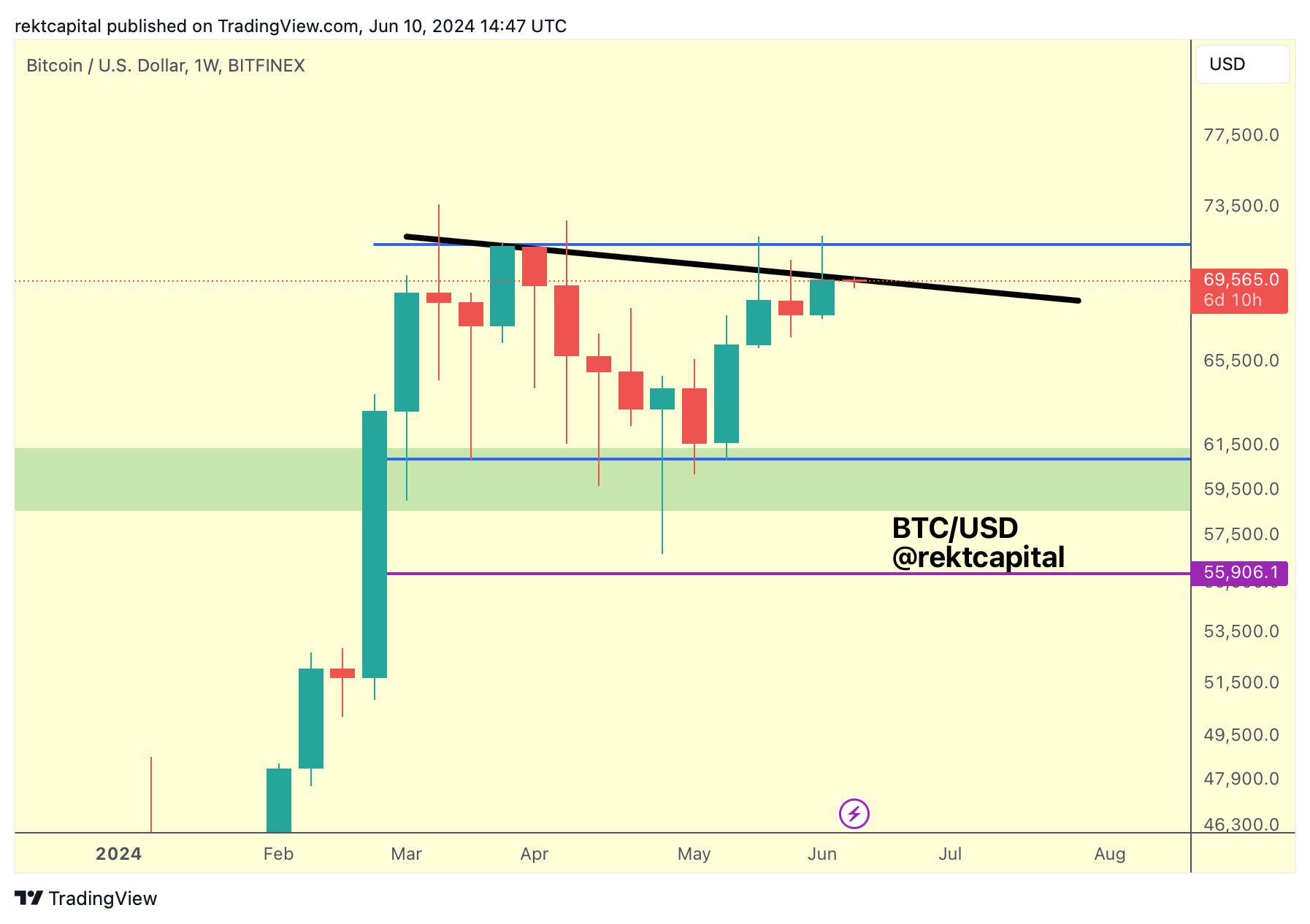 Over the past several weeks, Bitcoin has successfully retested the old All Time High area as new support (green) and has since rallied to the very top of the Re-Accumulation Range.