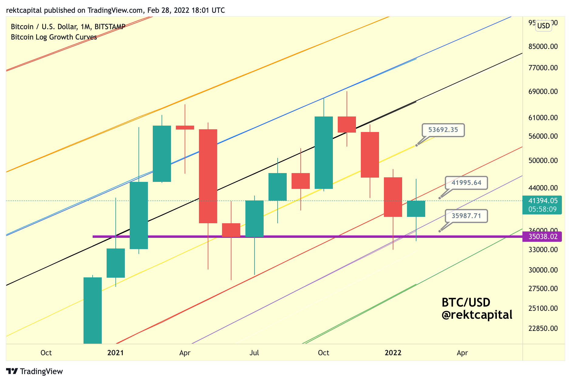 - Monthly Close above ~$42000 would be a bullish turn of technical events, as per the Bitcoin Logarithmic Growth Curves.