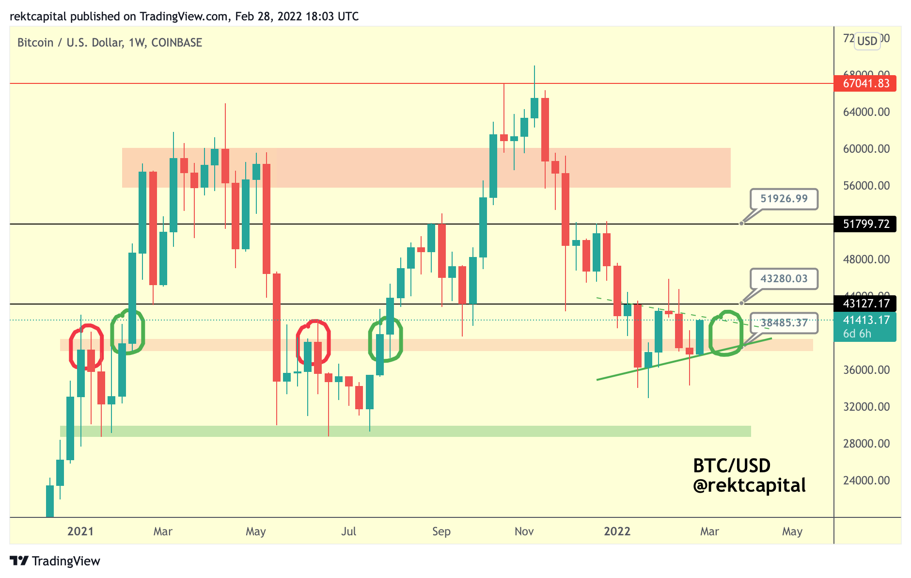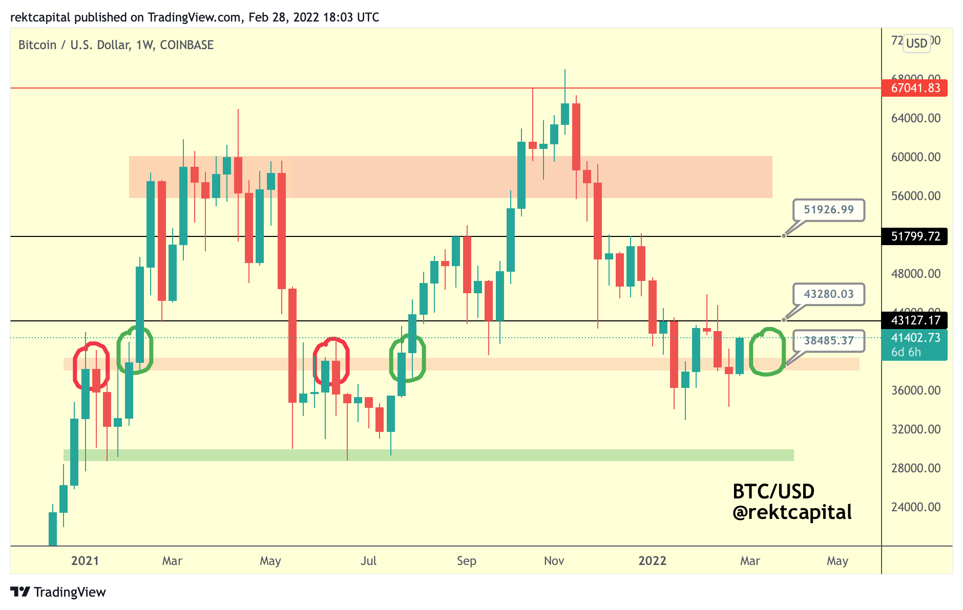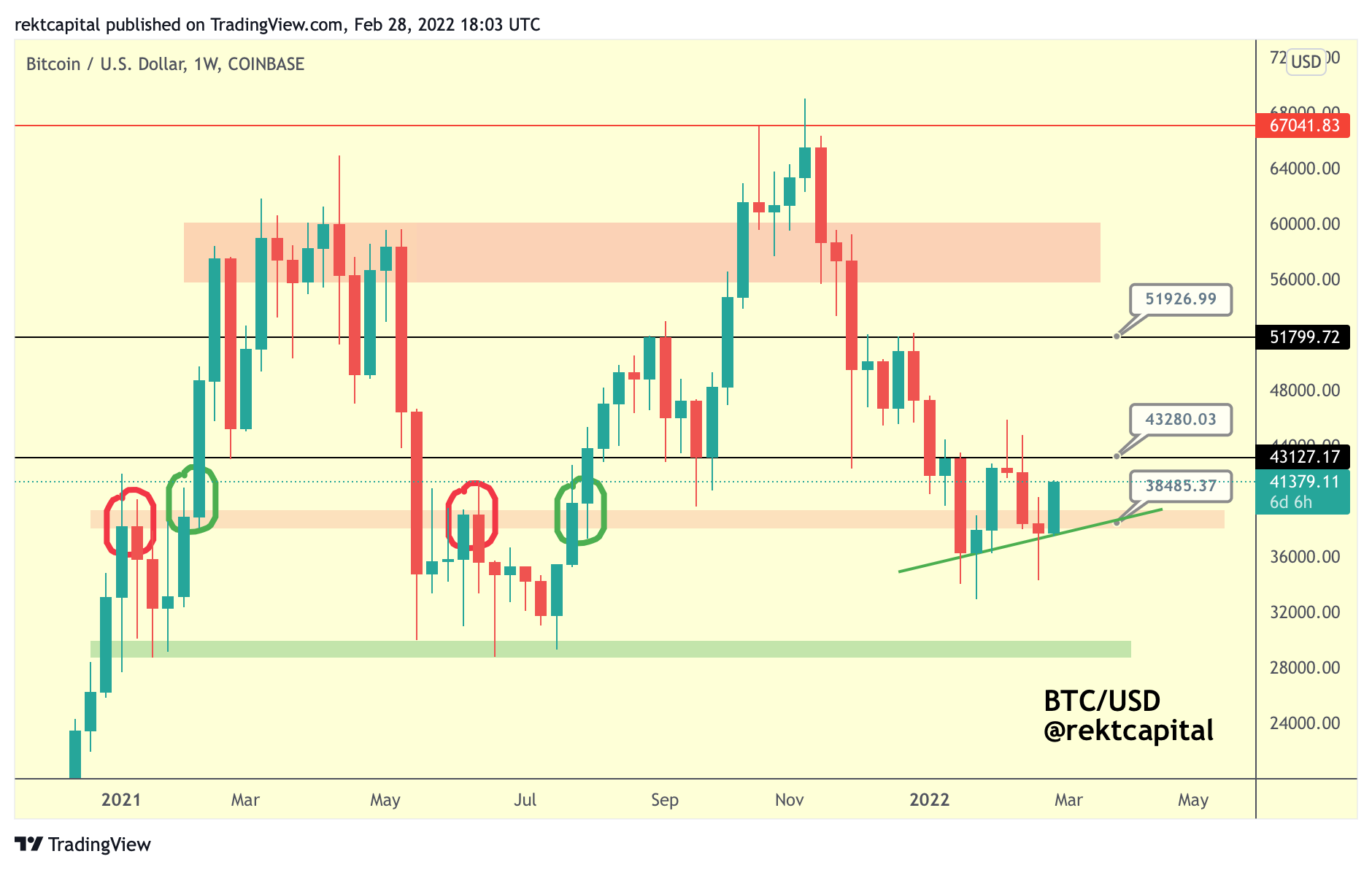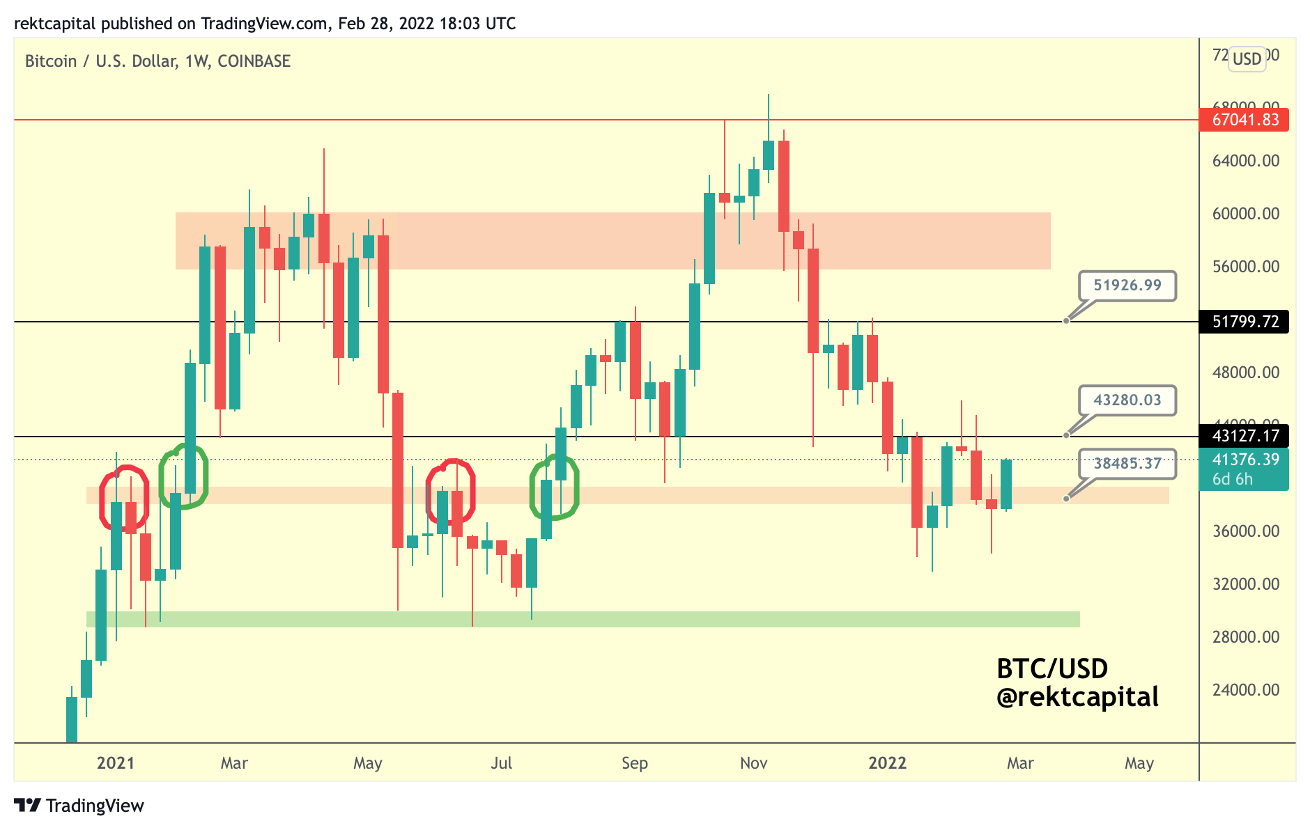 But even though Bitcoin has reclaimed the red area as support on lower timeframes, Bitcoin may very well need to repeat this feat on the higher timeframe - specifically the Weekly timeframe.