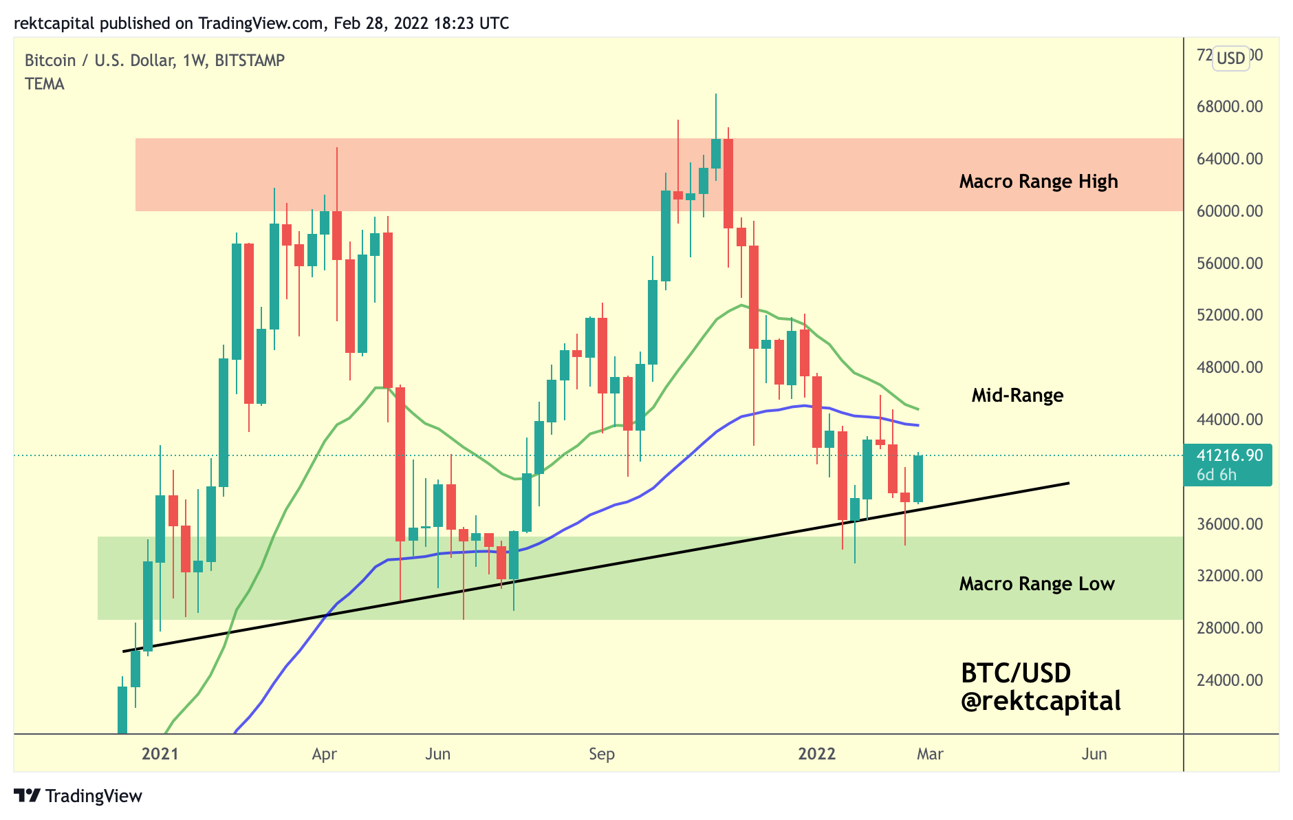 - Bitcoin may soon challenge the two key Bull Market EMAs that need to be flipped into support for price to enter the upper half of the $28000-$69000 macro range.