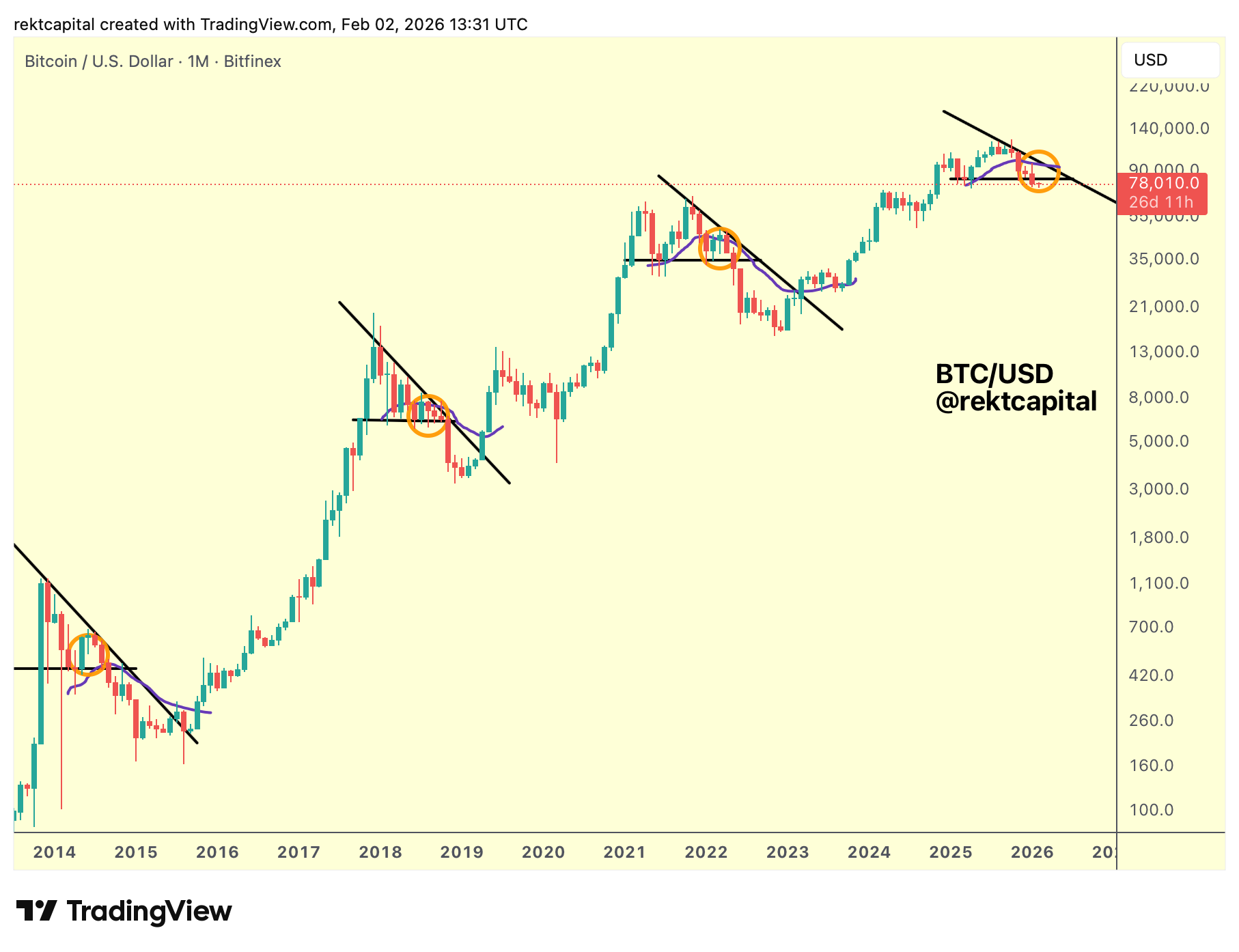 These macro relief rallies, highlighted historically by the orange regions on the chart, demonstrate a recurring tendency for price to react upward from support, but they do not represent full trend reversals to new highs.