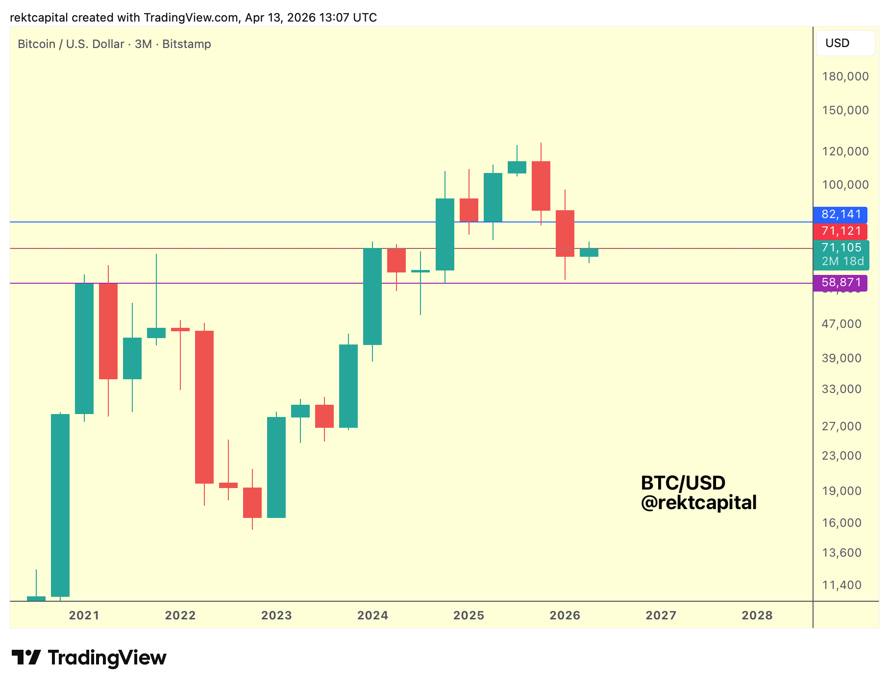 The 2024 quarterly resistance at $71,121 (red, prior multi-quarter resistance turned support) was never properly retested as support after the breakout.