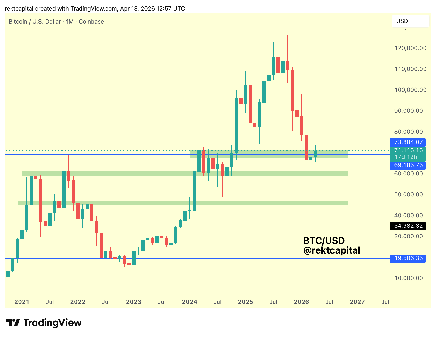 On the Monthly timeframe, Bitcoin is currently positioned between $69,185 (blue, 2021 All Time High) and $73,884 (blue, 2024 All Time High), with both old highs together forming a broader cluster, supply region, or supply zone.