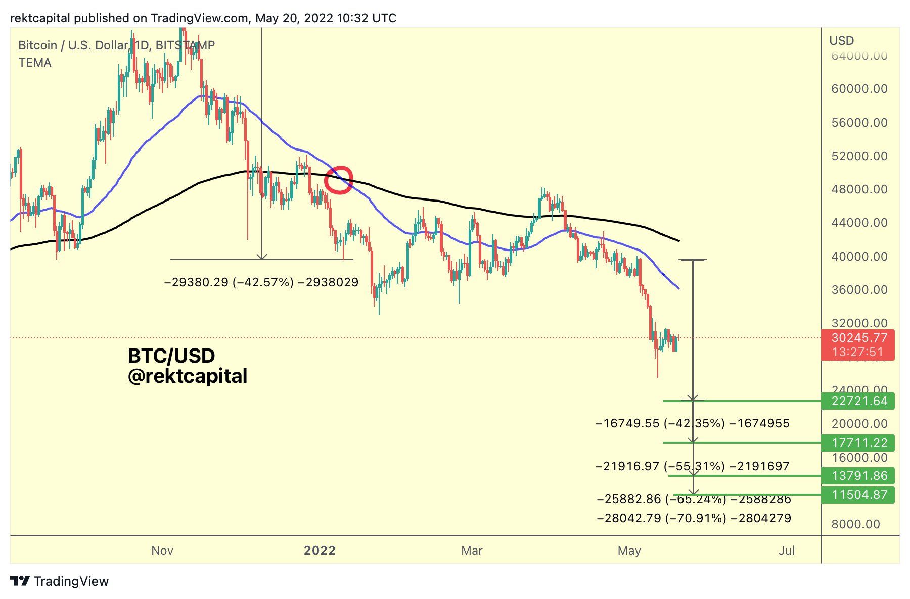 In the instance that $20K indeed sees downside continuation from the $20K support, the next immediate supports are $17165 and ~$13900.