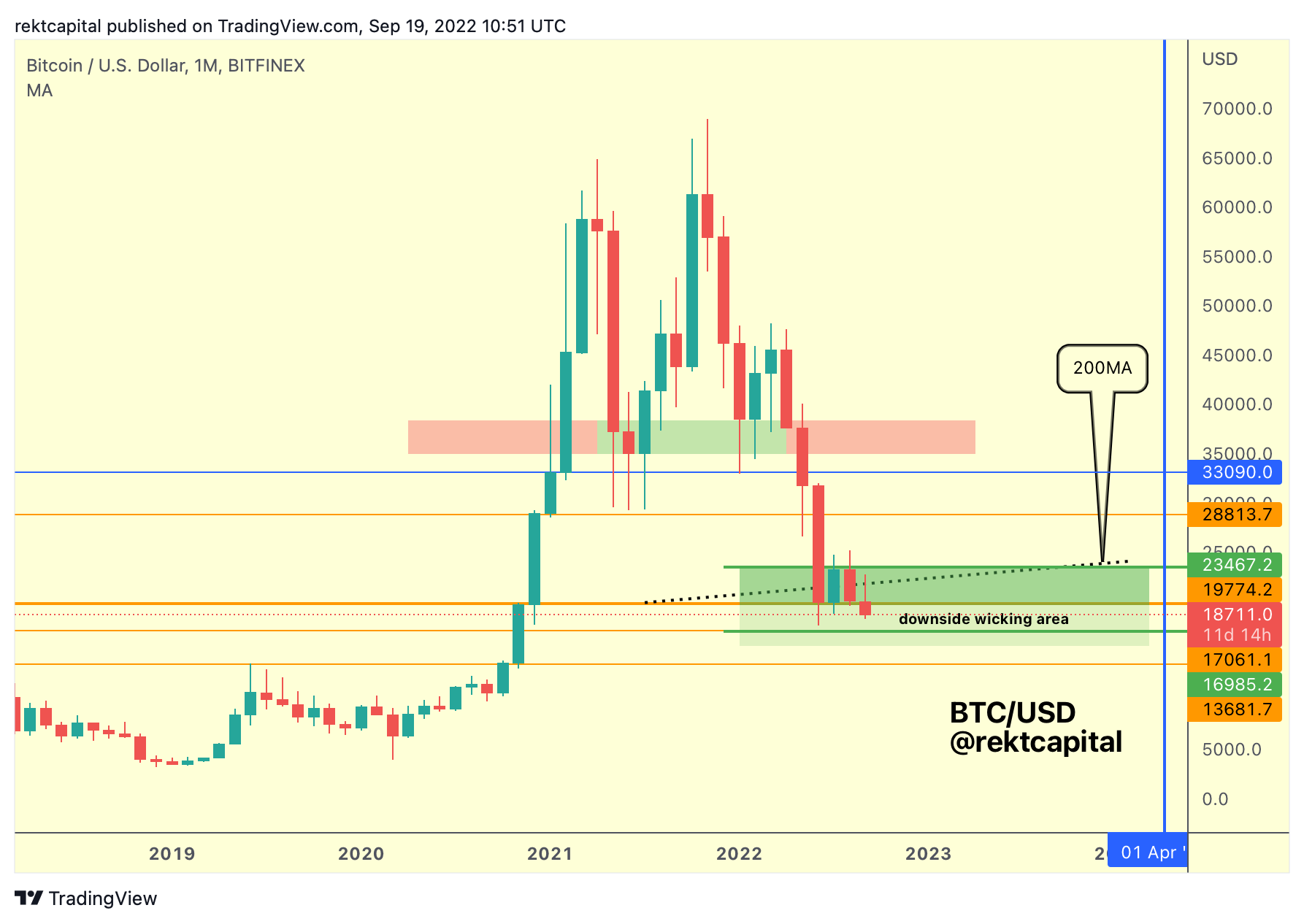 Of course, price is flipping the 200-week MA into new resistance and doing so with the psychological round level of $20K as well, then we’ll see price go deeper inside the box, where the most extreme scenario for downside could take price to as low as $11500, which would imply tremendous downside wicking below the $13900 Monthly support: