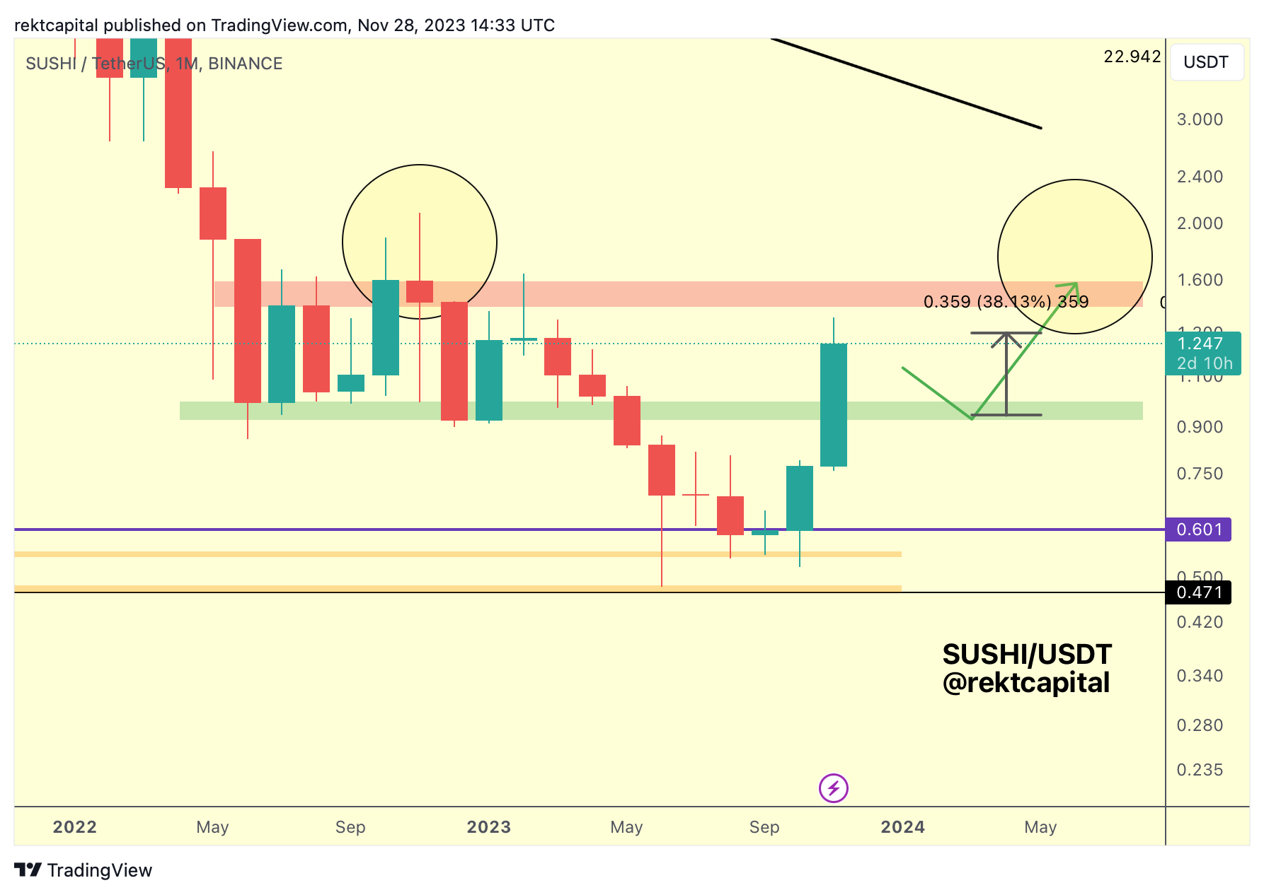 Overall, SUSHI is on the cusp of confirming its return to this macro range (green-red) and any dips would likely solidifying and re-affirm green as new support, with the red region above acting as the major resistance ahead for SUSHI.
