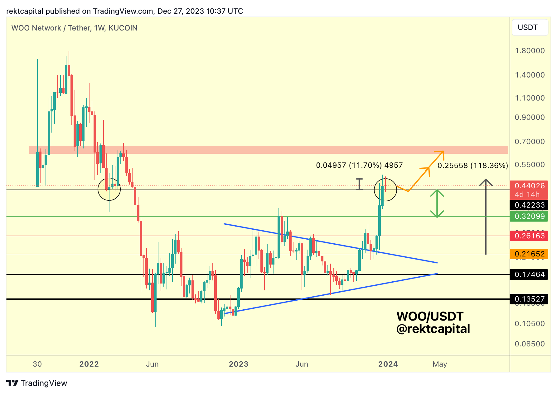 WOO performed a Weekly Candle Close above the black $0.42 level of resistance, which is already a notable technical step to take towards positioning price for further continuation.