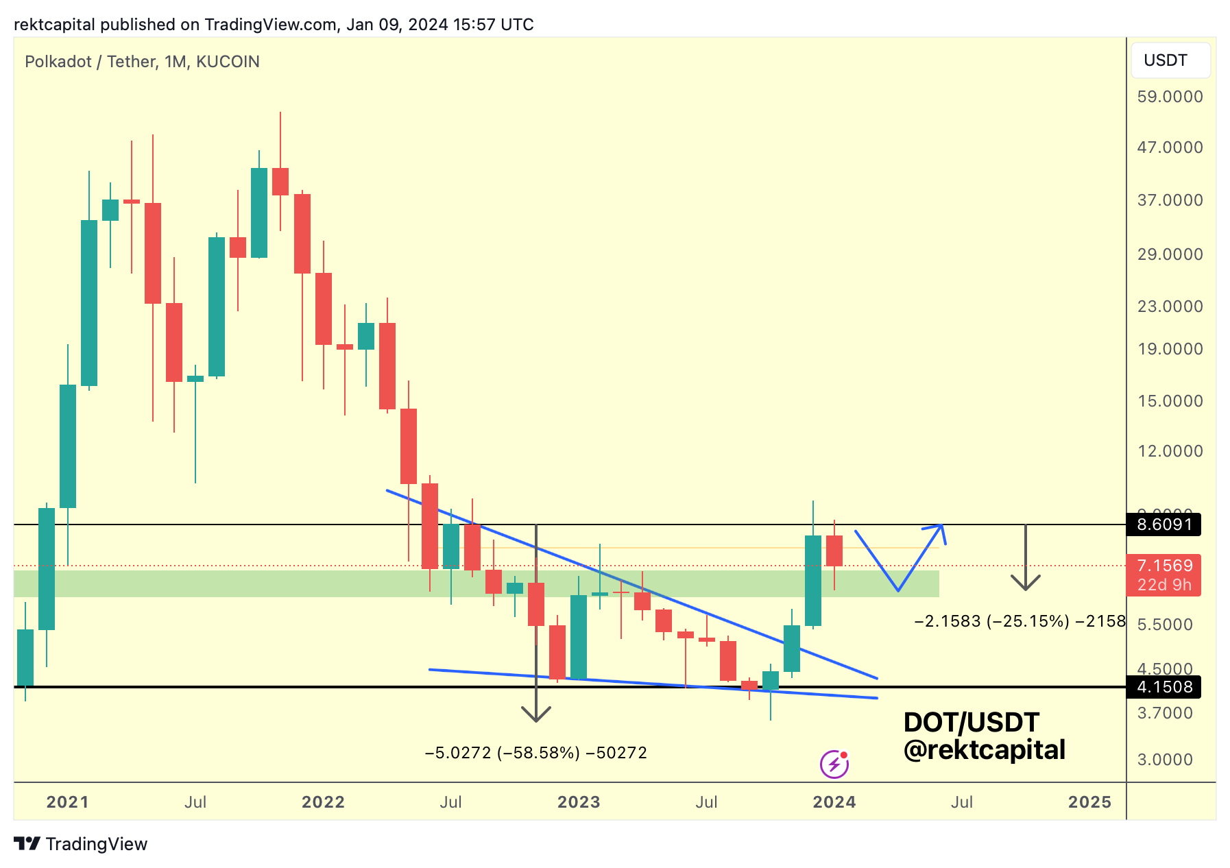 When DOT rejected from the Range High resistance of $8.60 (black), Polkadot retraced -58% in total.